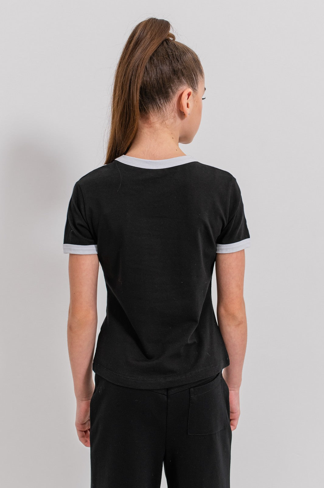 Detaliile care îl diferențiază sunt tivurile negre aplicate la guler și la mâneci, oferind un contrast plăcut și un aspect fresh, ușor sport. Croiala lejeră permite libertate de mișcare, iar textura materialului oferă o senzație plăcută pe piele, ideală pentru copiii activi.