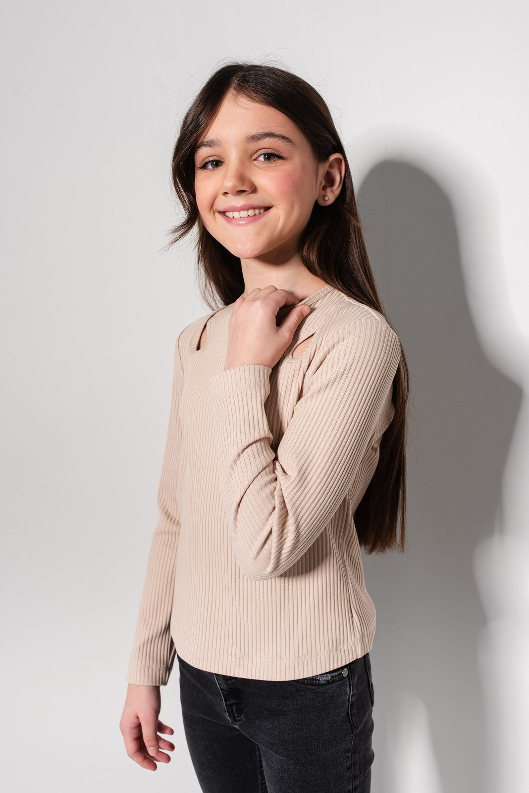 Confecționată dintr-un material elastic, plăcut la atingere, bluza se adaptează perfect formei corpului, oferind libertate de mișcare și confort pe tot parcursul zilei. Textura fină, în dungi verticale, creează un efect optic subțire și elegant, iar decupajele delicate de la umeri adaugă un accent modern și jucăuș.