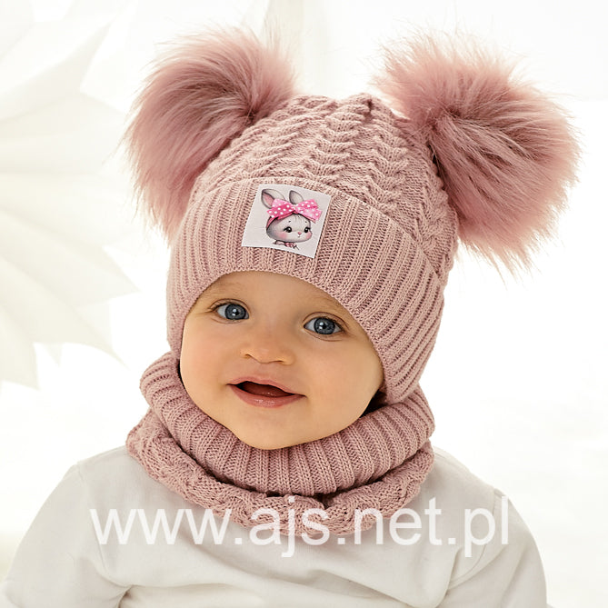 Căciula are un design modern, cu model împletit tip torsadă, completat de un doua moațe pufose din blăniță artificială și o fundiță decorativă strălucitoare, pentru un plus de farmec. Fularul circular este moale, elastic și ușor de purtat, oferind protecție termică optimă în jurul gâtului.