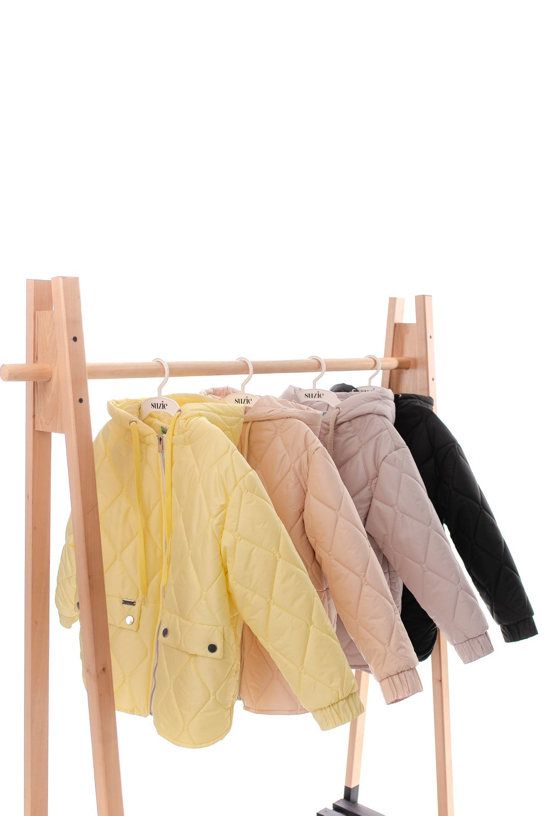 Design: Matlasat în romburi, croială dreaptă cu glugă și buzunare frontale