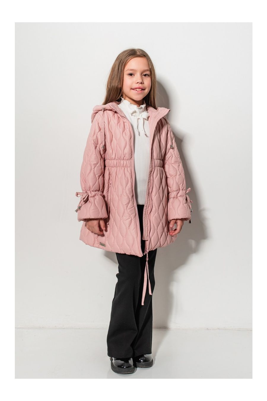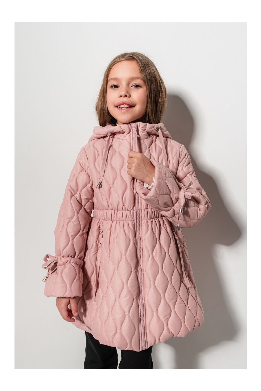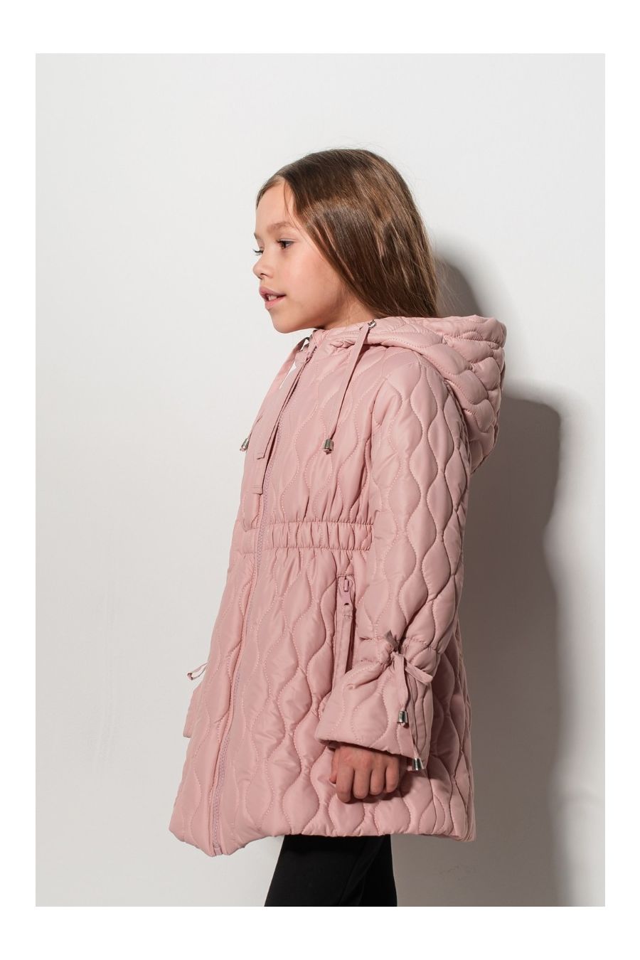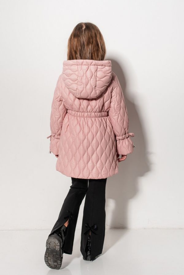 Design: Matlasare tip romb, glugă cu șnur, talie elastică, fundițe decorative la mâneci, buzunare laterale cu fermoar