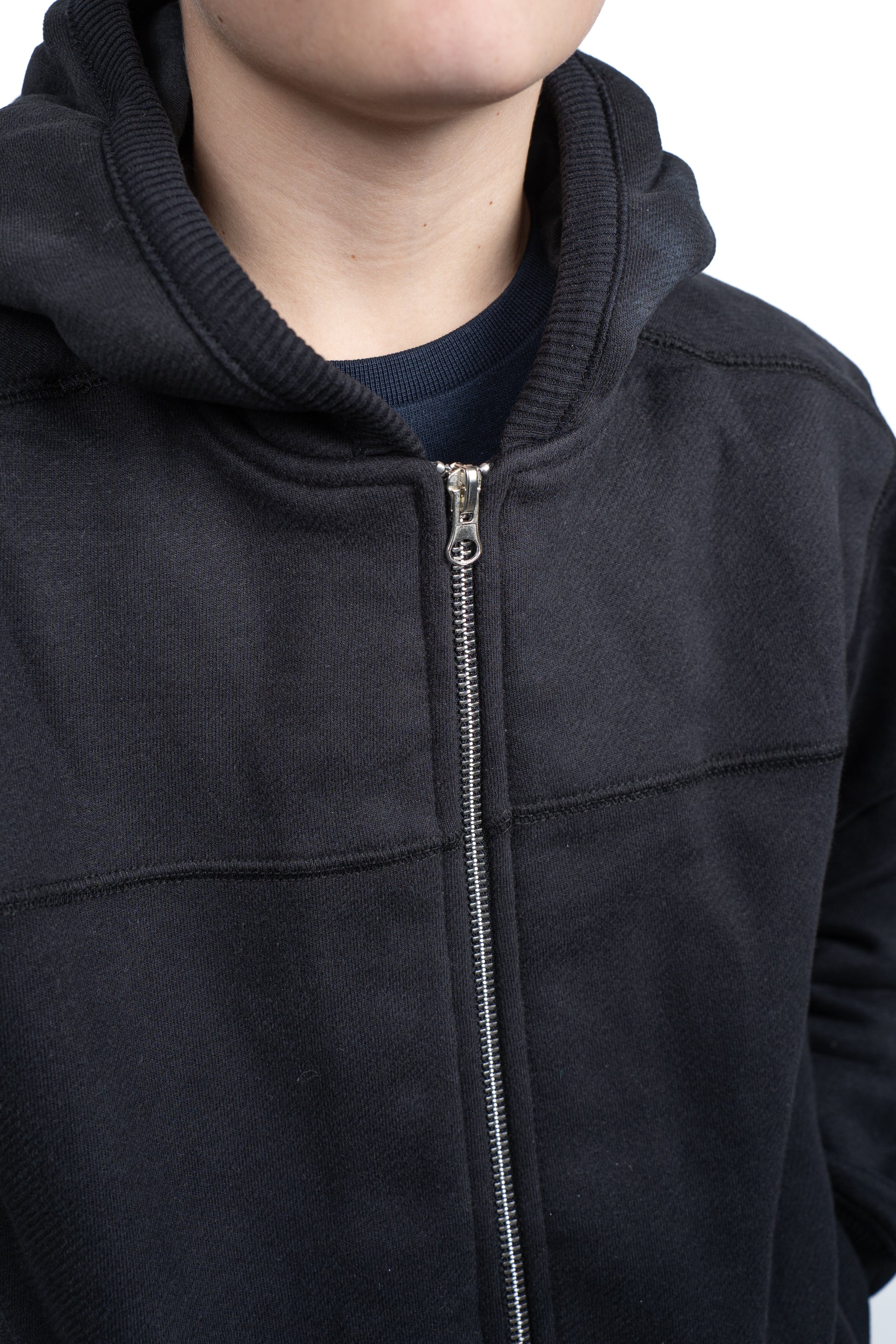 Realizat din material moale și călduros, hanoracul are o nuanță de negru clasic, ușor de integrat în ținute casual sau sport. Croiala lejeră, gluga practică și închiderea frontală cu fermoar metalic oferă funcționalitate și un plus de confort. Buzunarele laterale sunt ideale pentru păstrarea micilor obiecte sau pentru încălzirea mâinilor, iar manșetele și baza elastică asigură o potrivire optimă.