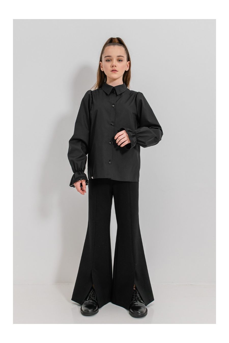 Acești pantaloni pentru fete evazati par să spună: „Da, pot fi cool și eleganți în același timp!” Cu o croială evazată spectaculoasă și cusaturi discrete în față, sunt alegerea ideală pentru micile domnișoare care vor să se simtă speciale la școală, la un eveniment sau într-o zi obișnuită de „azi sunt eu șefa garderobei!”. Țesătura densă le oferă structură, iar talia confortabilă asigură libertate de mișcare — fie că dansează, defilează sau doar... impresionează.