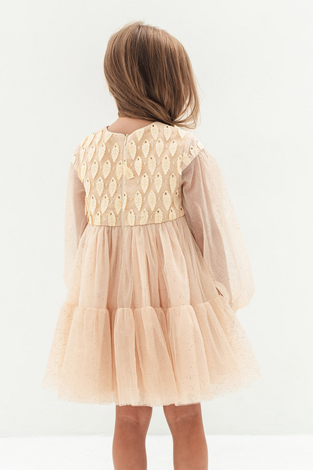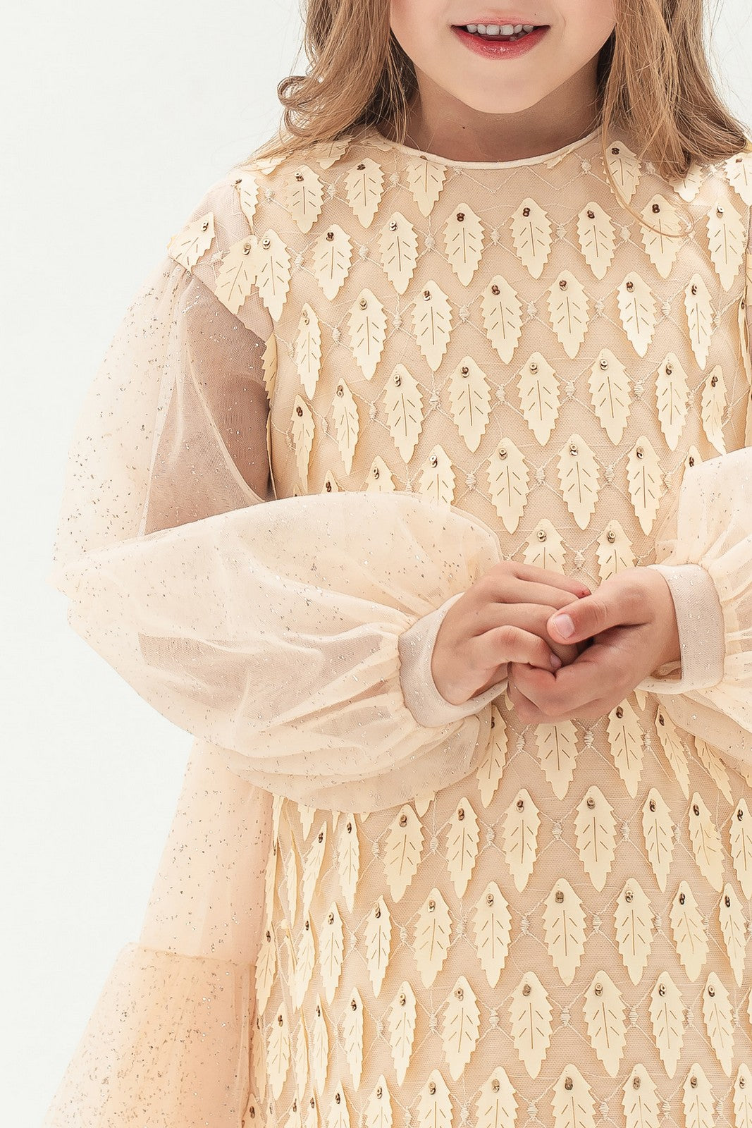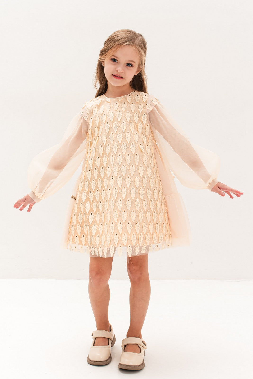 Confecționată dintr-un material ușor și plăcut la atingere, rochia impresionează prin nuanța sa caldă de bej și prin broderia fină cu motive geometrice, care adaugă un plus de textură și rafinament. Mânecile lungi, din voal translucid, oferă o notă de grație și lejeritate, completând perfect croiala amplă și confortabilă a rochiei.