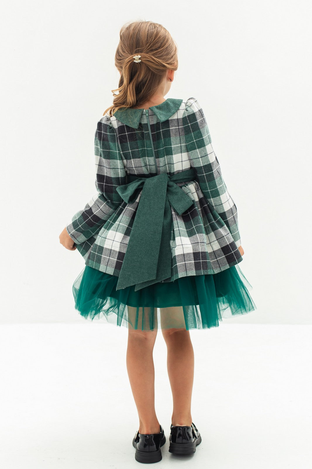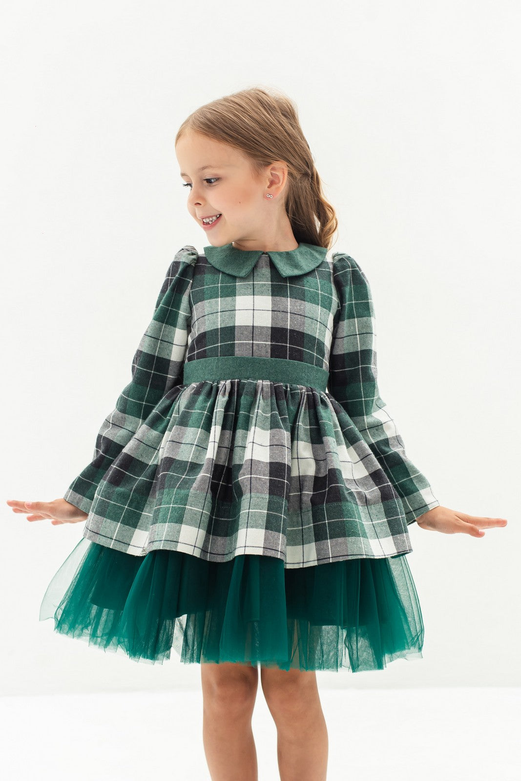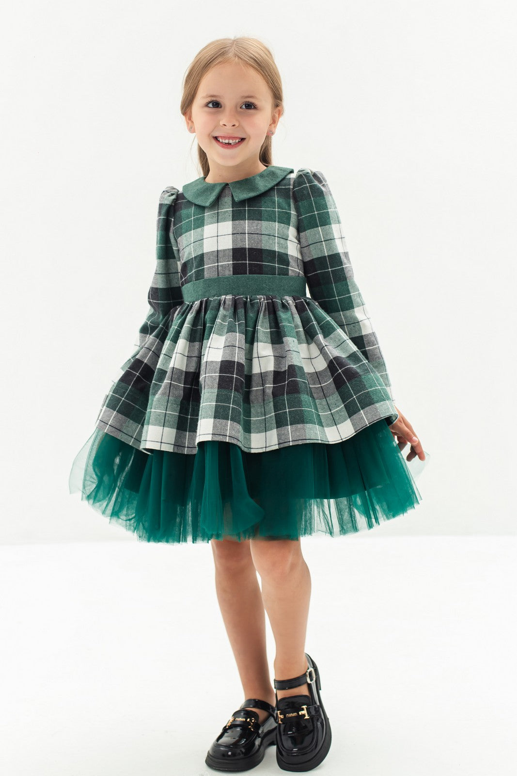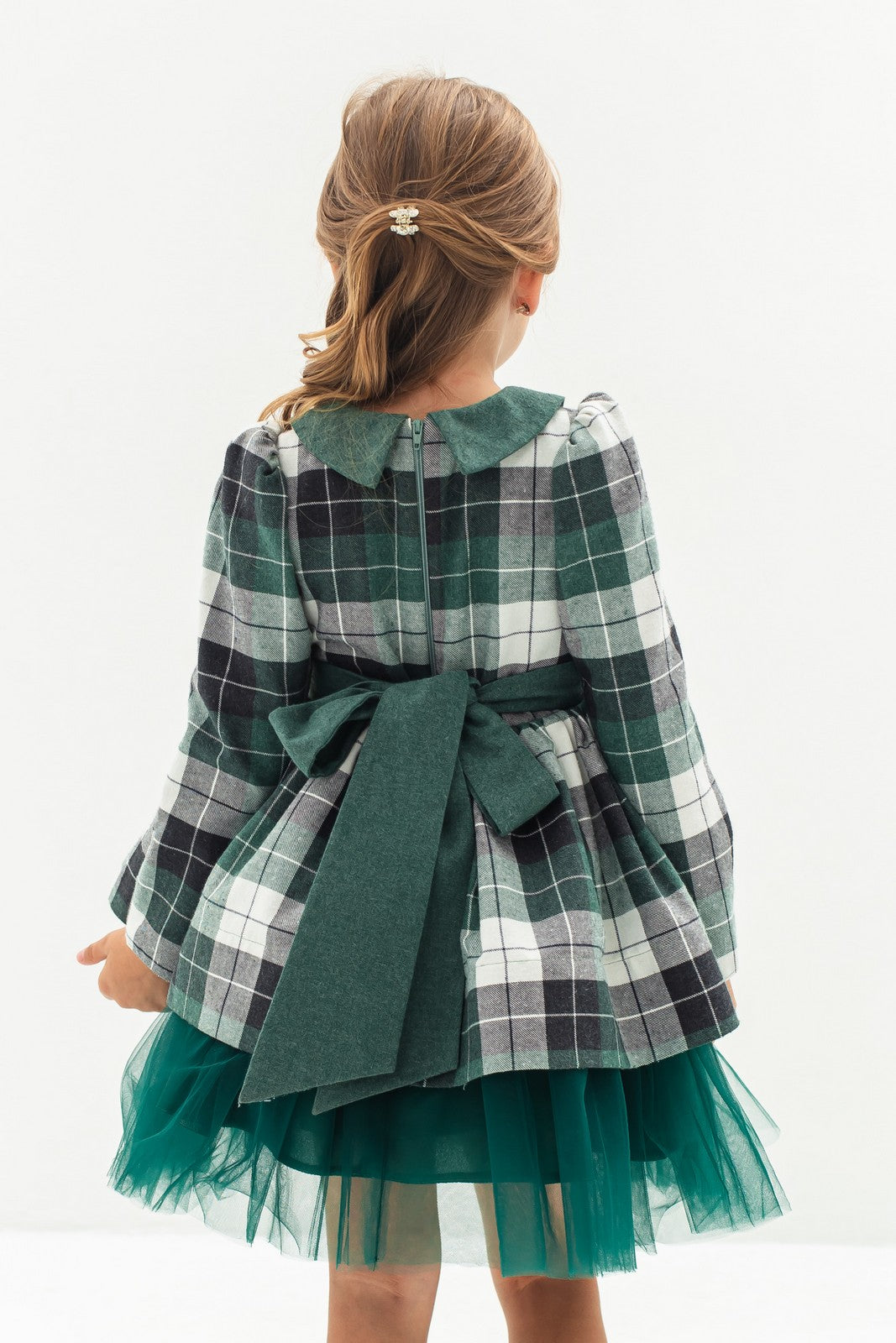 Realizată dintr-un material moale și călduros, cu imprimeu în carouri în nuanțe de verde și alb, rochia se remarcă prin croiala amplă și detaliile atent lucrate. Gulerul rotund și mânecile bufante completează designul vintage, iar tulle-ul verde de la baza rochiei adaugă un plus de volum și rafinament.