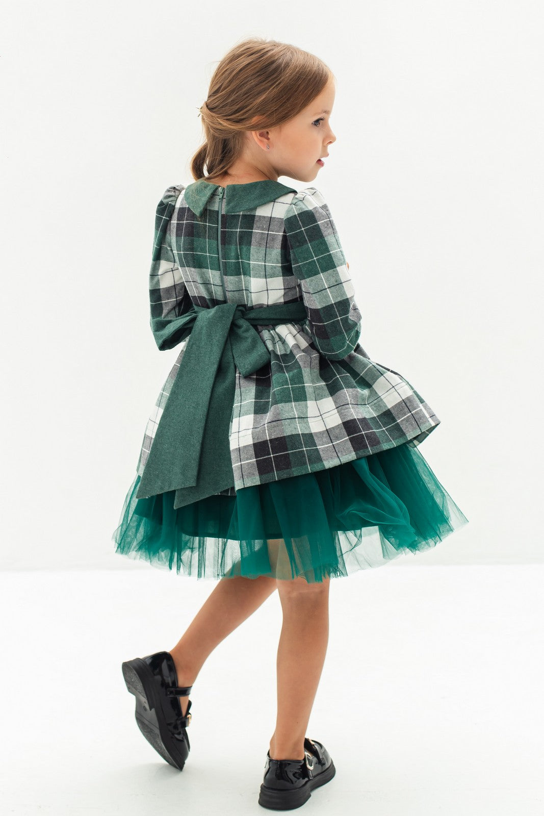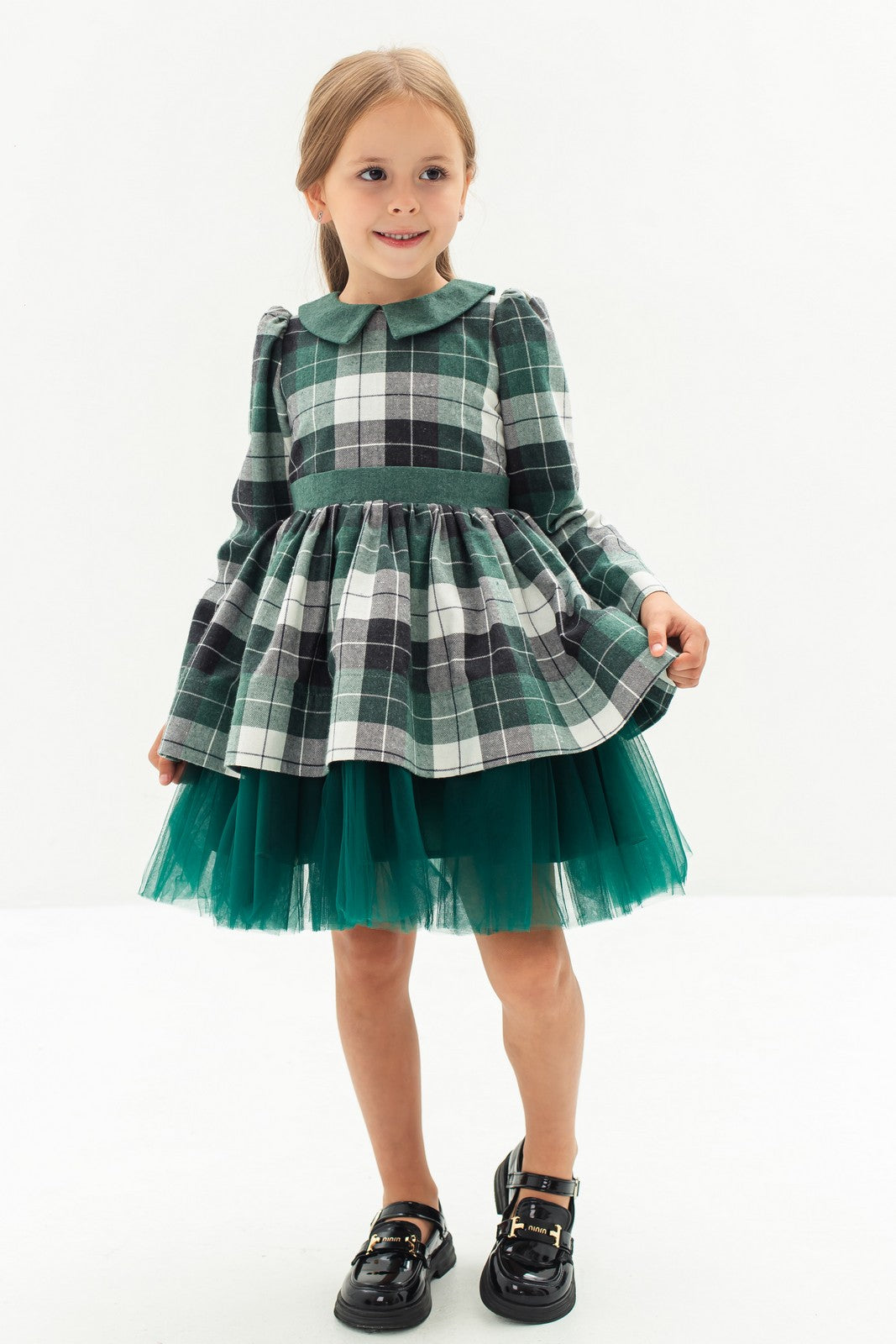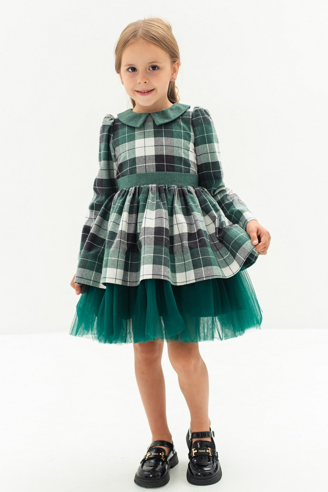Realizată dintr-un material moale și călduros, cu imprimeu în carouri în nuanțe de verde și alb, rochia se remarcă prin croiala amplă și detaliile atent lucrate. Gulerul rotund și mânecile bufante completează designul vintage, iar tulle-ul verde de la baza rochiei adaugă un plus de volum și rafinament.