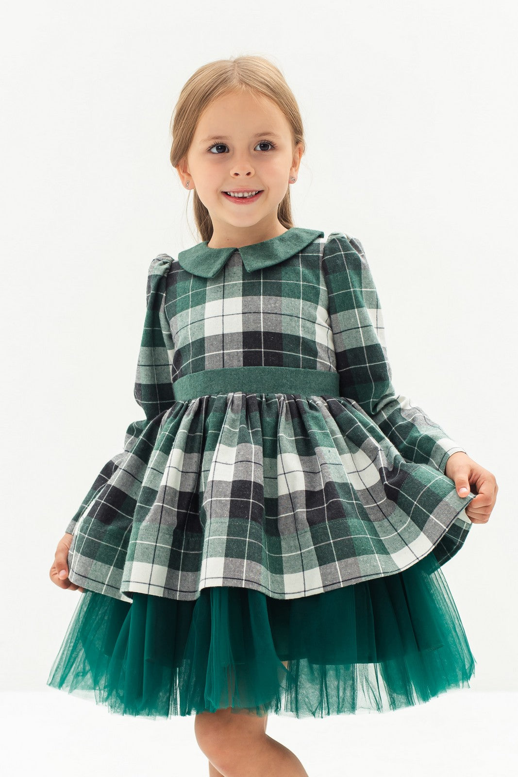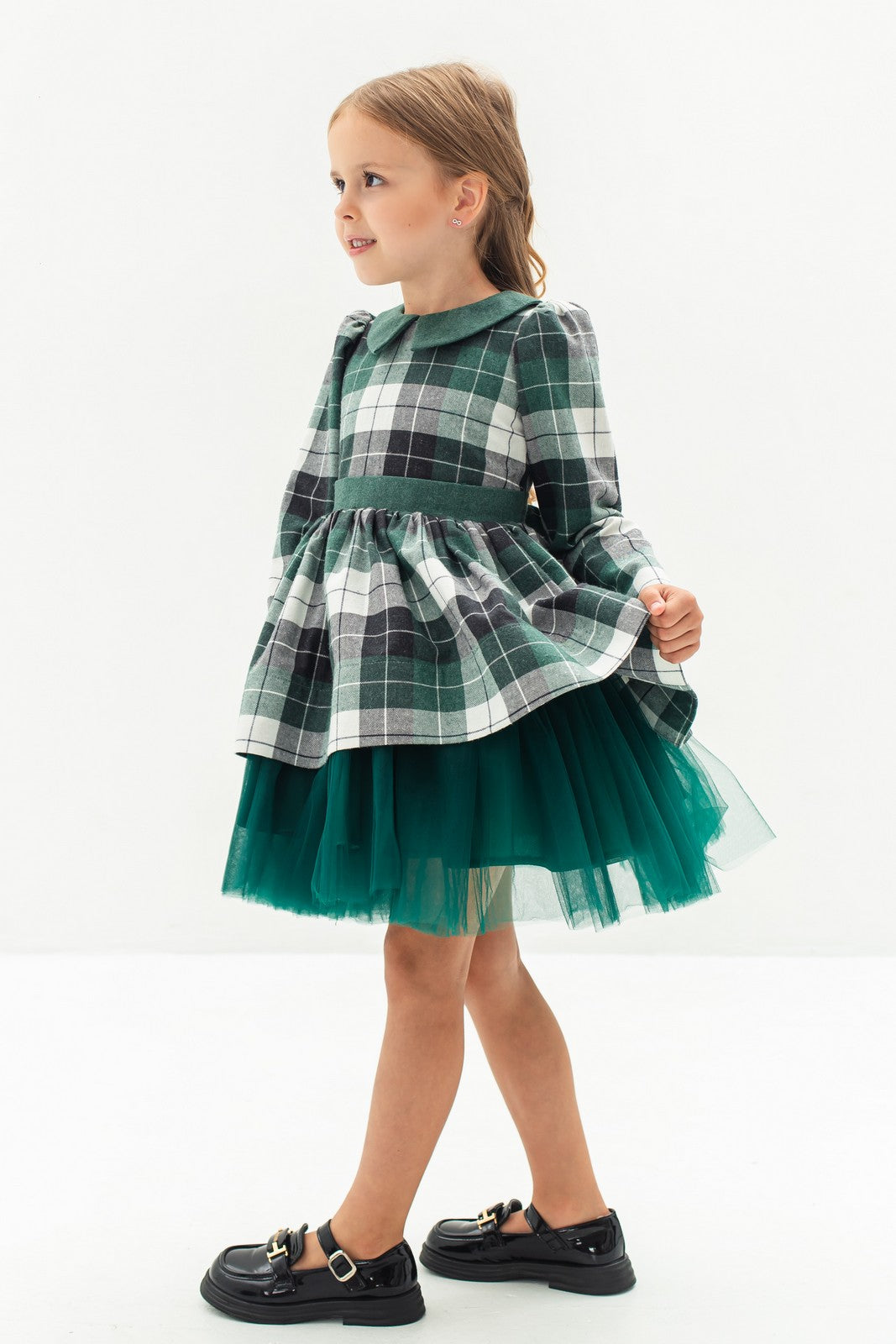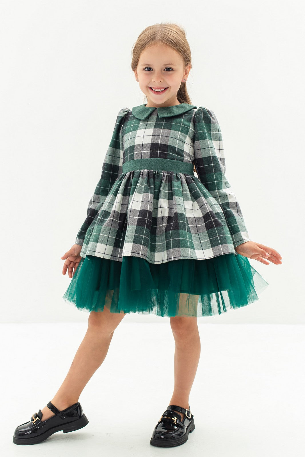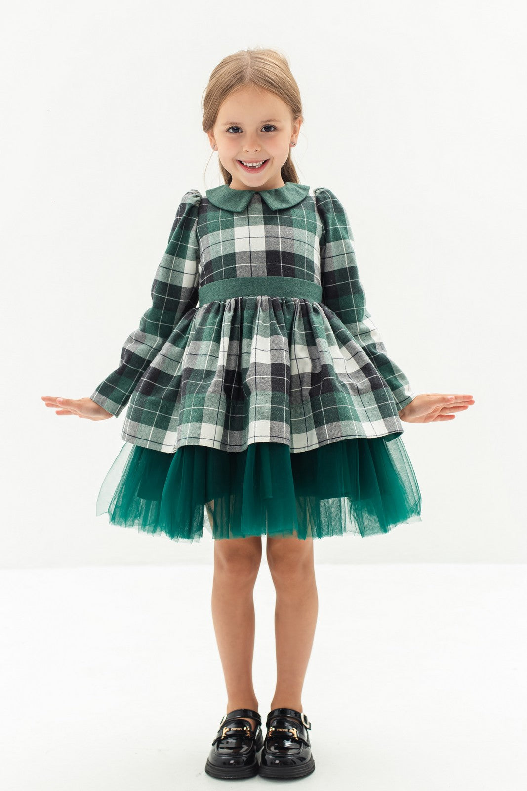 Realizată dintr-un material moale și călduros, cu imprimeu în carouri în nuanțe de verde și alb, rochia se remarcă prin croiala amplă și detaliile atent lucrate. Gulerul rotund și mânecile bufante completează designul vintage, iar tulle-ul verde de la baza rochiei adaugă un plus de volum și rafinament.