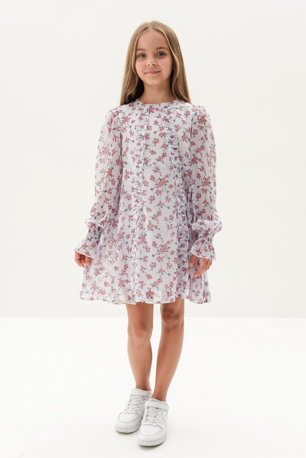 Design: Rochie cu imprimeu floral, volănașe decorative, mâneci lungi cu elastic la manșete