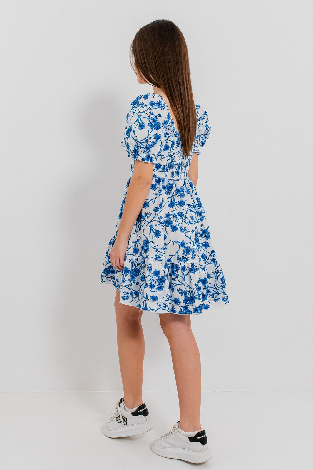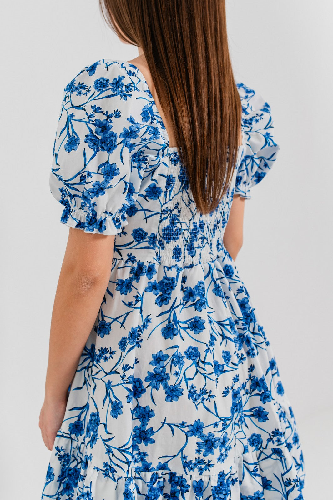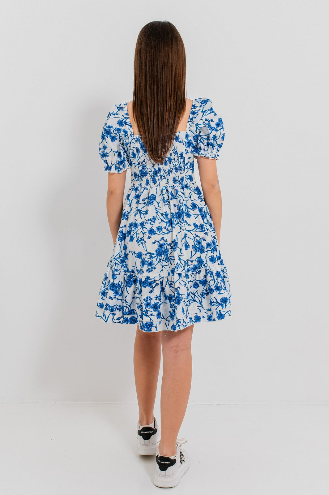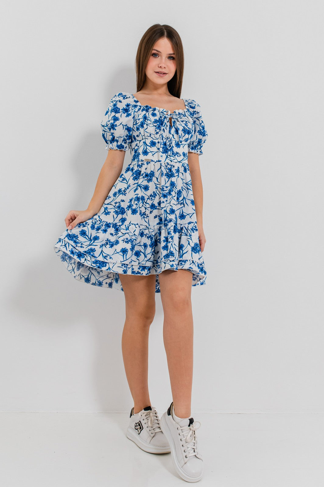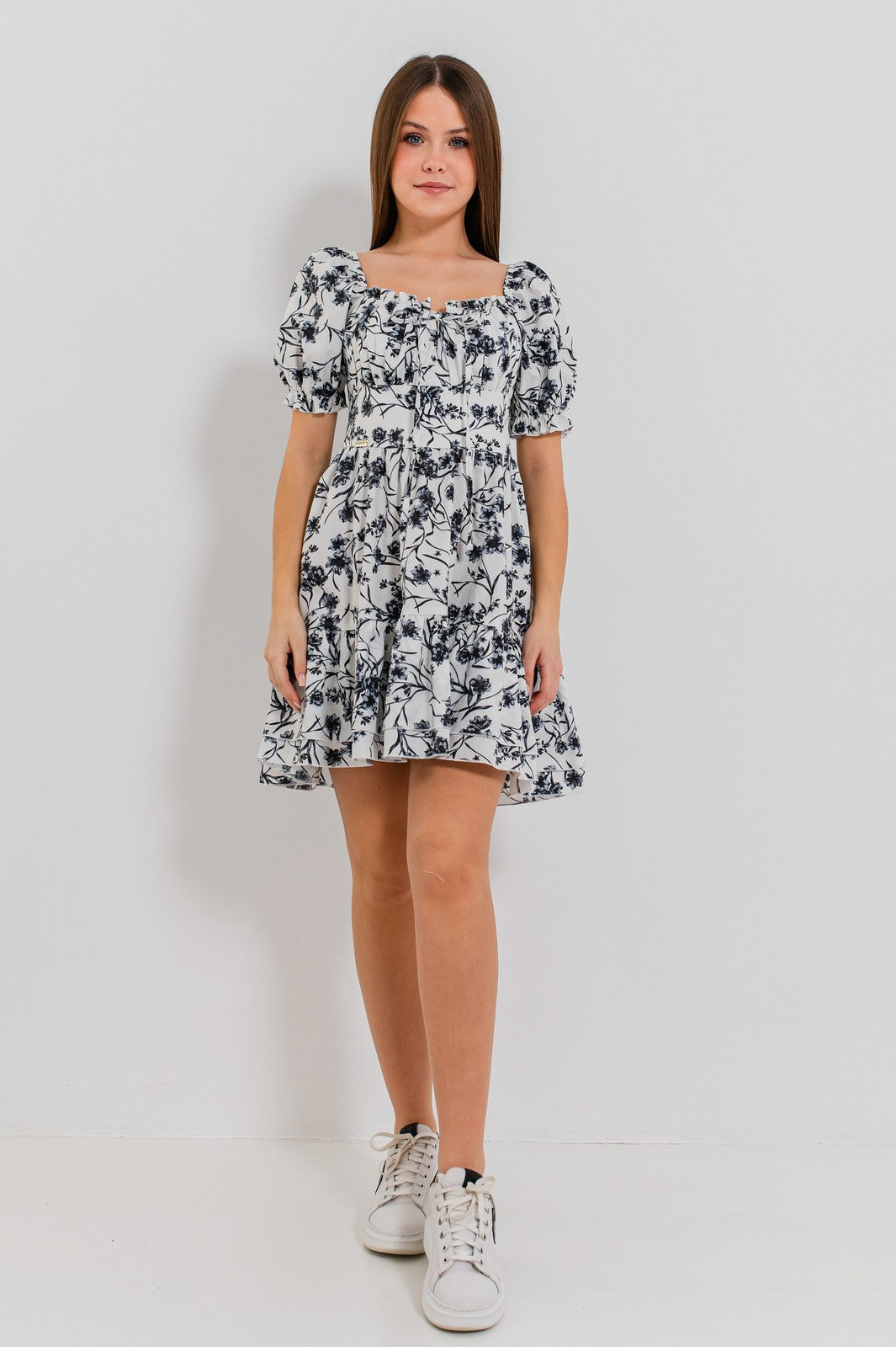 Rochia ALIYANA este definiția echilibrului perfect între rafinament și prospețime. Cu un imprimeu floral monocrom care nu trece neobservat, această rochie cucerește prin detalii feminine, precum decolteul pătrat cu fronseuri delicate și mânecile bufante care adaugă volum și stil. Croiala în A și volanul amplu de la bază dau rochiei o alură romantică, iar materialul ușor asigură confort pe tot parcursul zilei.