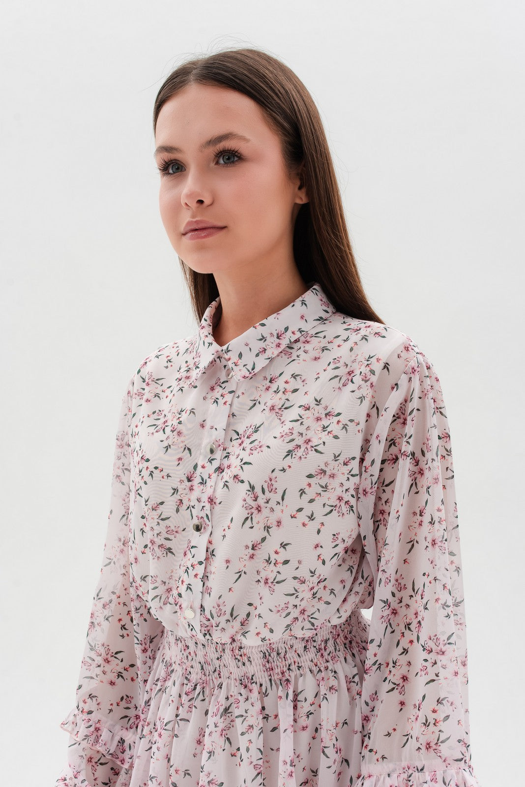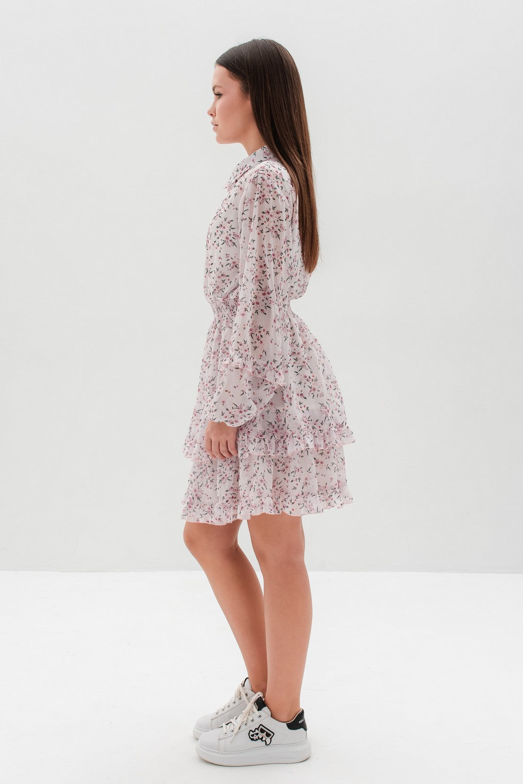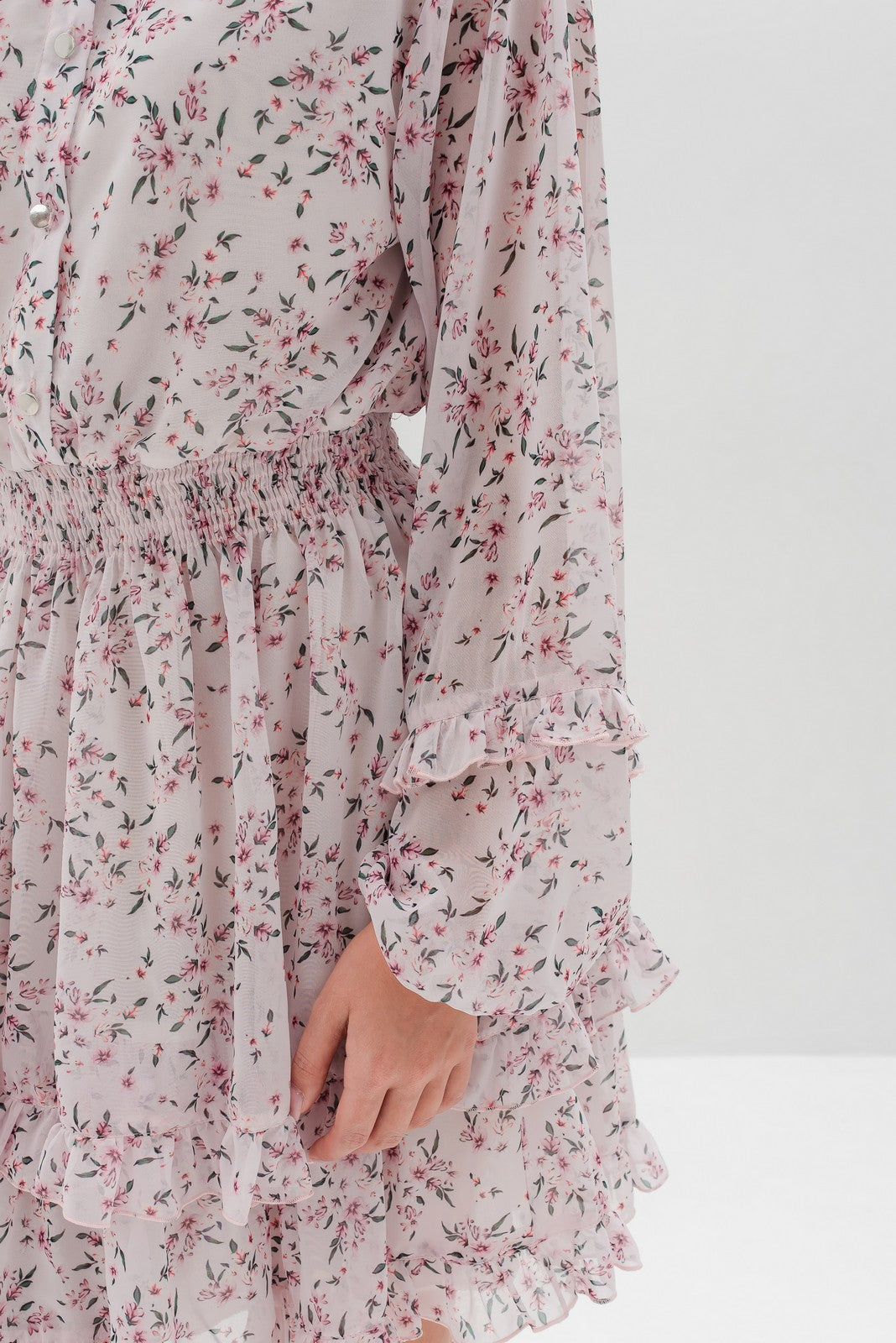 Design: Rochie cu croi lejer, mâneci lungi cu volane, talie elastică, închidere cu nasturi