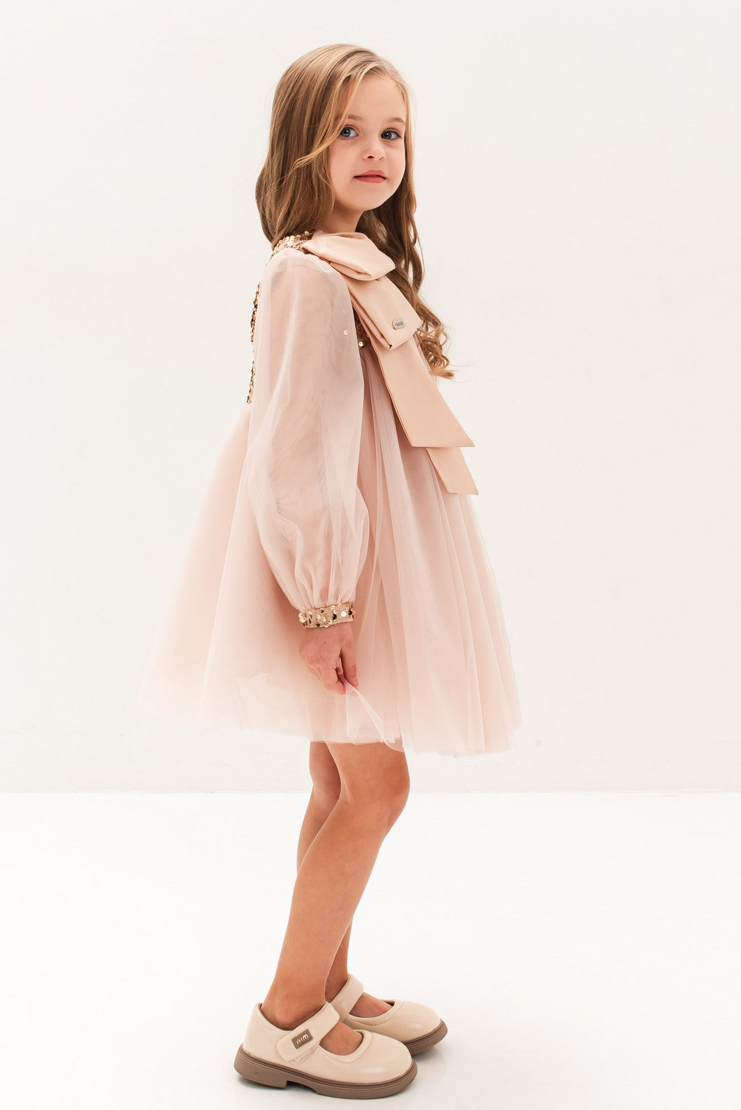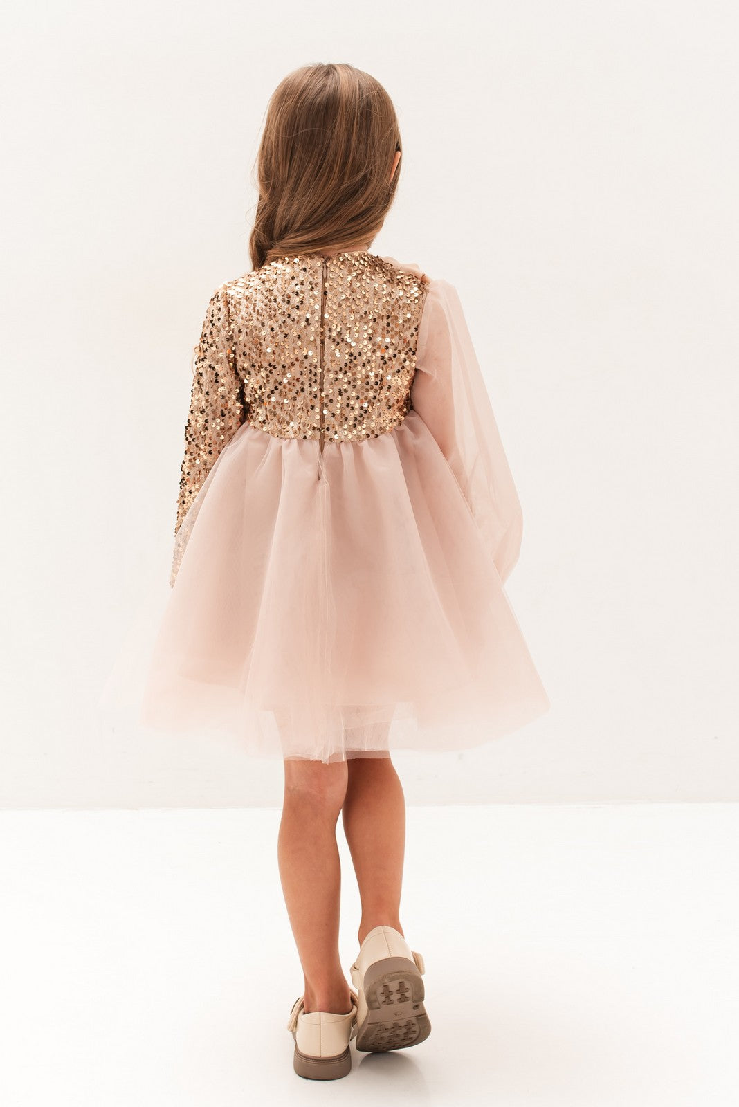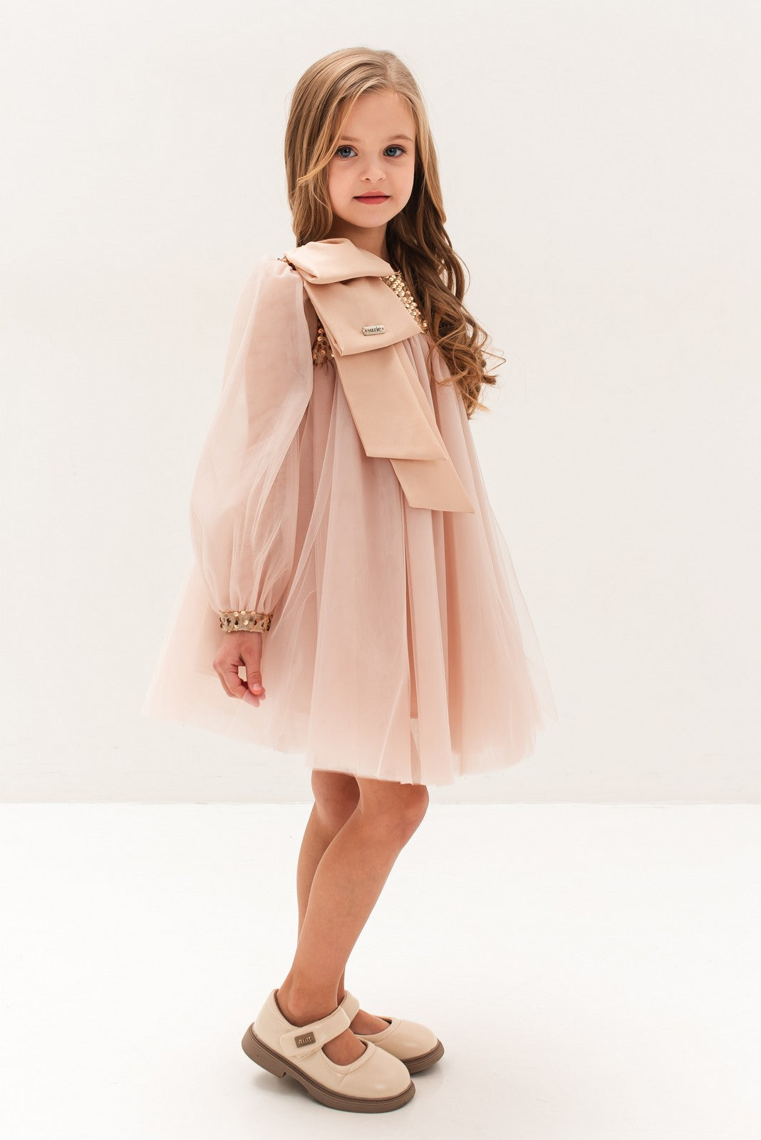 Această rochie rafinată este alegerea perfectă pentru micile domnișoare care doresc să impresioneze la orice ocazie specială. Realizată într-o nuanță delicată de roz, rochia „Abelia” se remarcă prin combinația de materiale fine: partea de sus cu paiete strălucitoare și mâneci transparente adaugă un aer sofisticat, în timp ce fusta amplă din tulle vaporos conferă volum și lejeritate. Accesoriul tip fundă aplicat pe umăr completează designul cu un detaliu feminin și elegant.