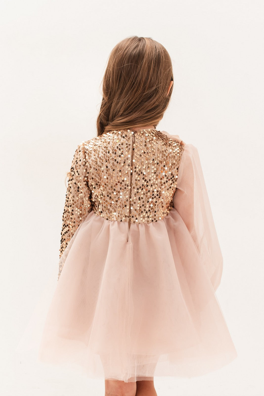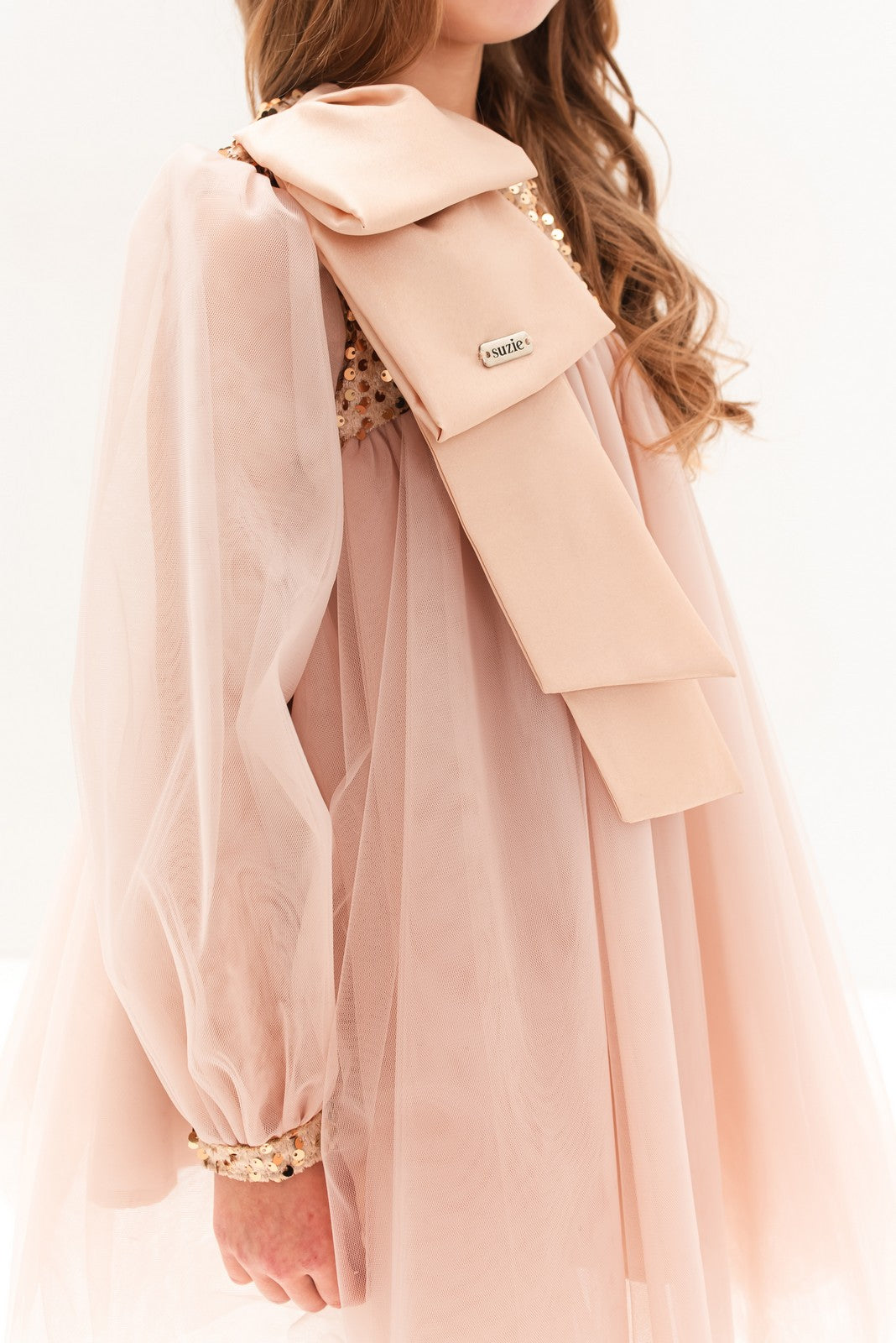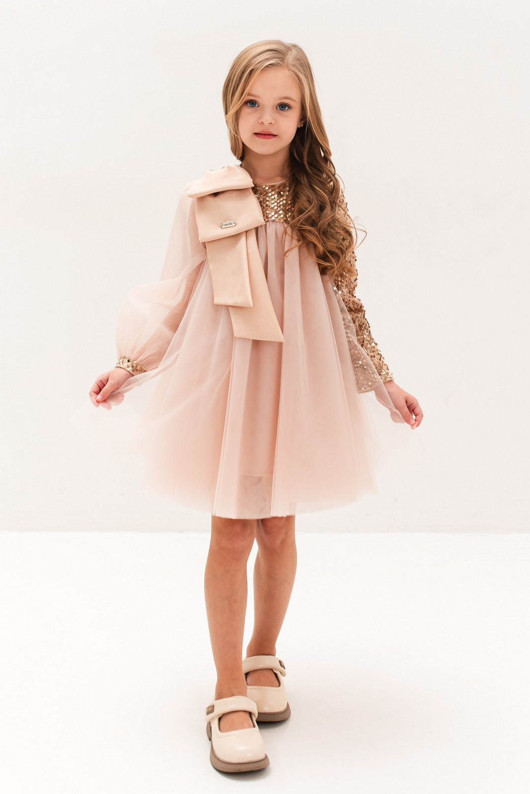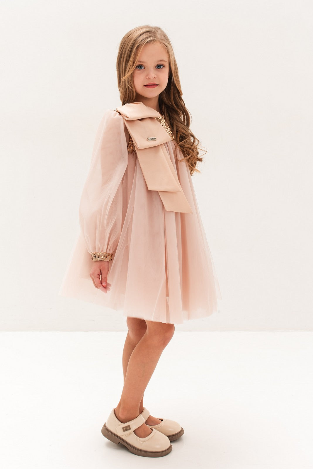 Această rochie rafinată este alegerea perfectă pentru micile domnișoare care doresc să impresioneze la orice ocazie specială. Realizată într-o nuanță delicată de roz, rochia „Abelia” se remarcă prin combinația de materiale fine: partea de sus cu paiete strălucitoare și mâneci transparente adaugă un aer sofisticat, în timp ce fusta amplă din tulle vaporos conferă volum și lejeritate. Accesoriul tip fundă aplicat pe umăr completează designul cu un detaliu feminin și elegant.