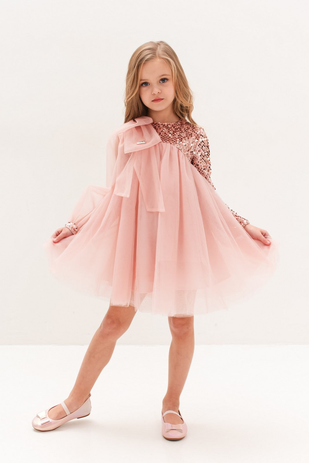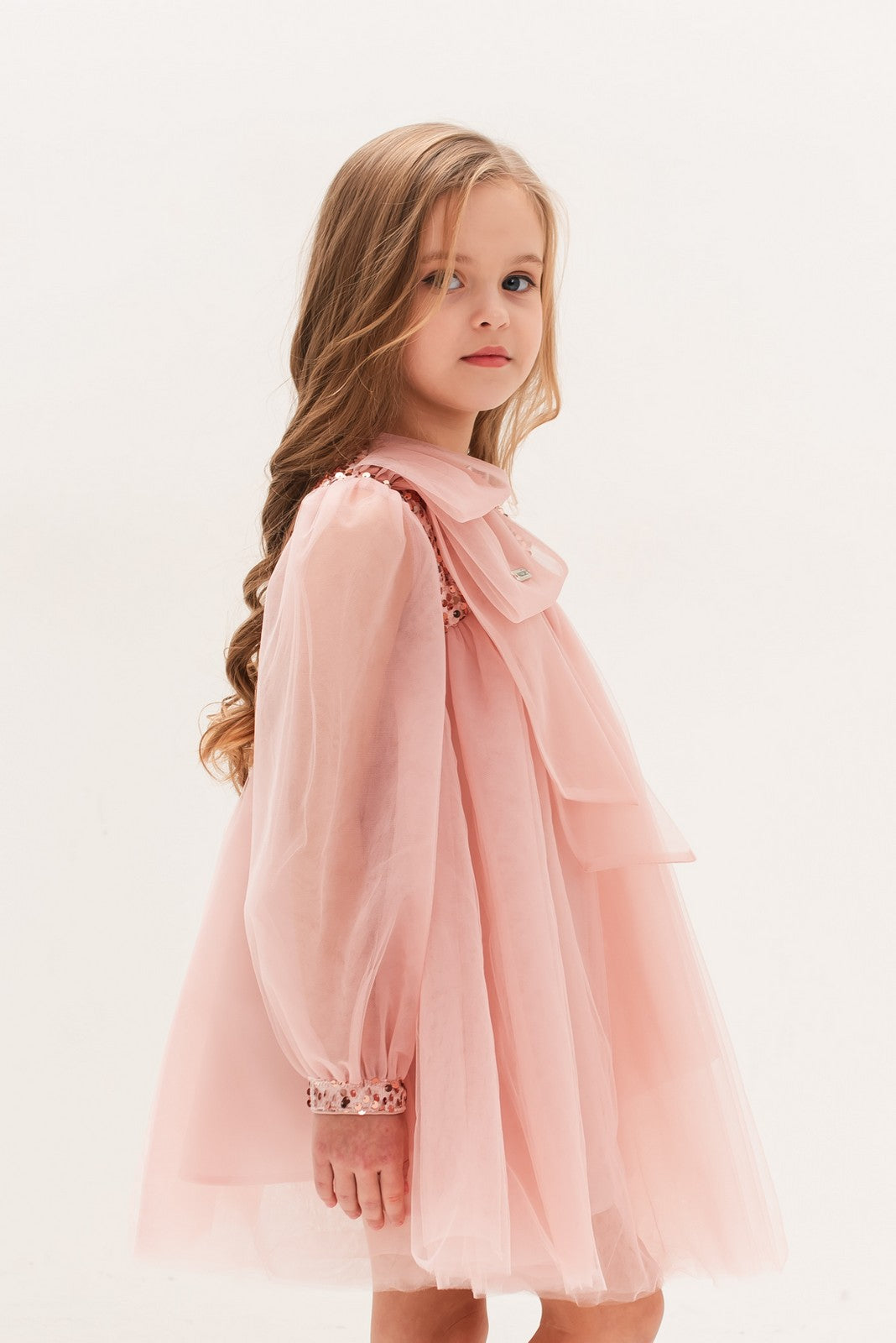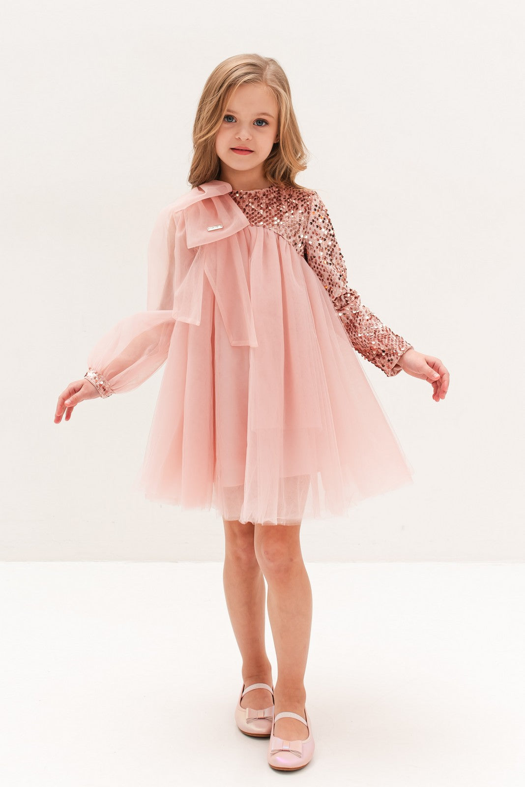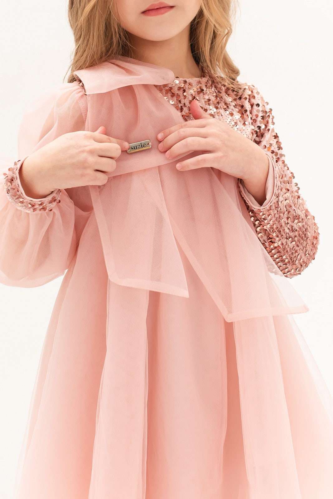 Această rochie rafinată este alegerea perfectă pentru micile domnișoare care doresc să impresioneze la orice ocazie specială. Realizată într-o nuanță delicată de roz, rochia „Abelia” se remarcă prin combinația de materiale fine: partea de sus cu paiete strălucitoare și mâneci transparente adaugă un aer sofisticat, în timp ce fusta amplă din tulle vaporos conferă volum și lejeritate. Accesoriul tip fundă aplicat pe umăr completează designul cu un detaliu feminin și elegant.