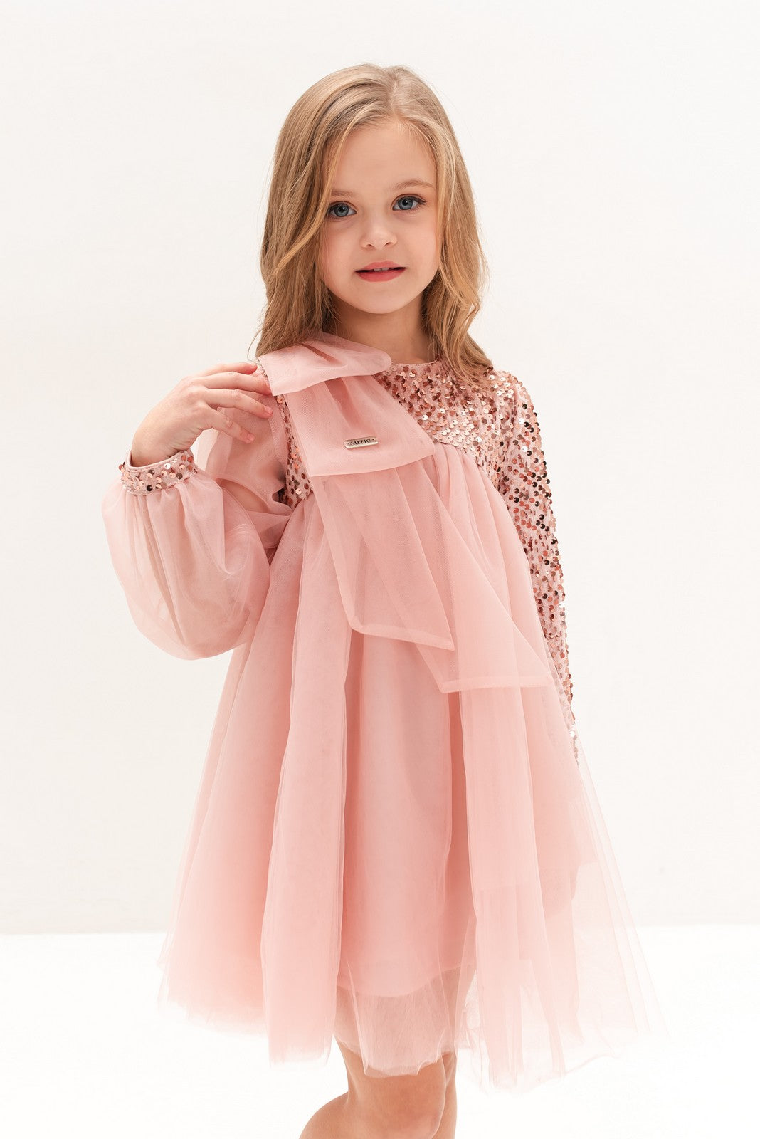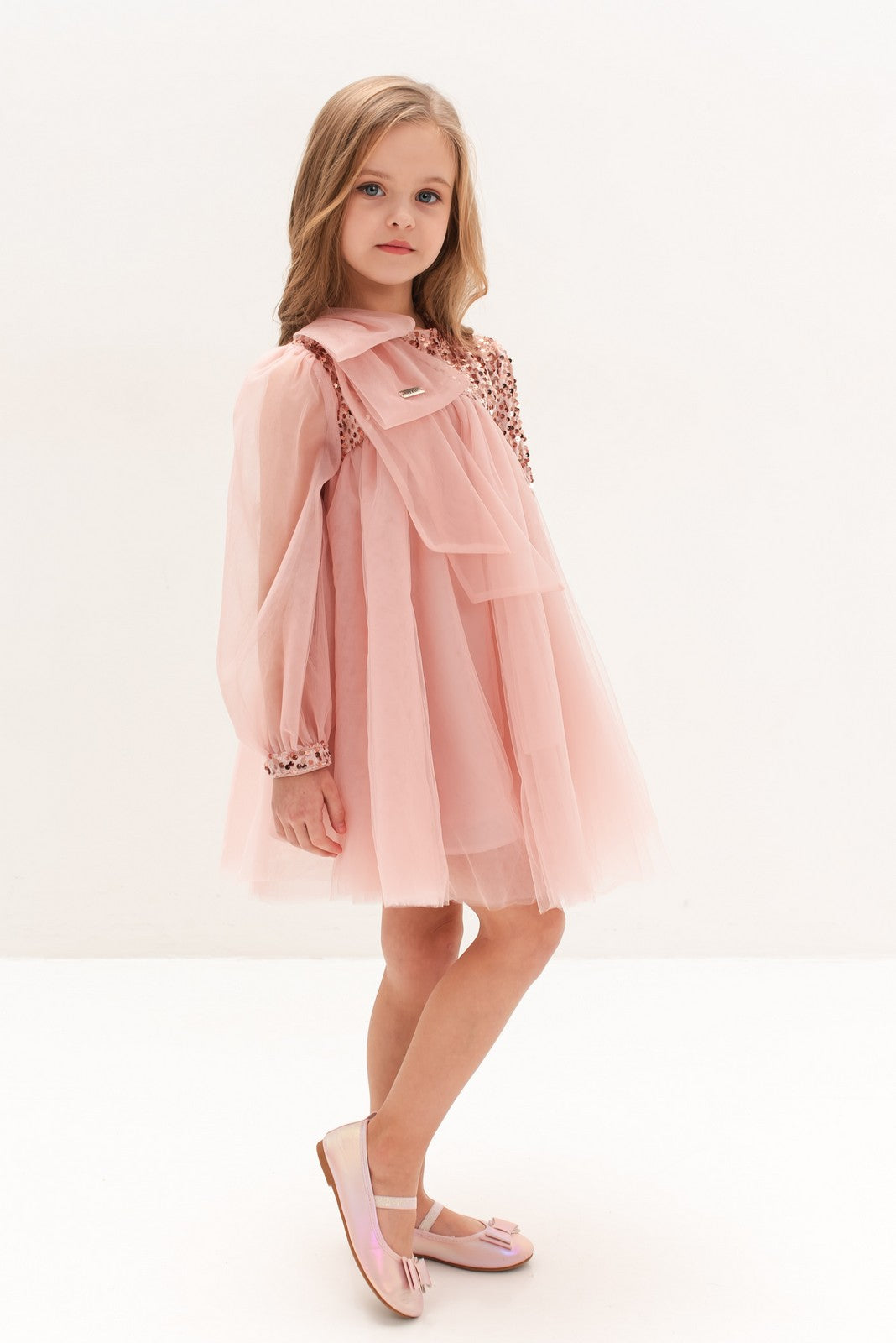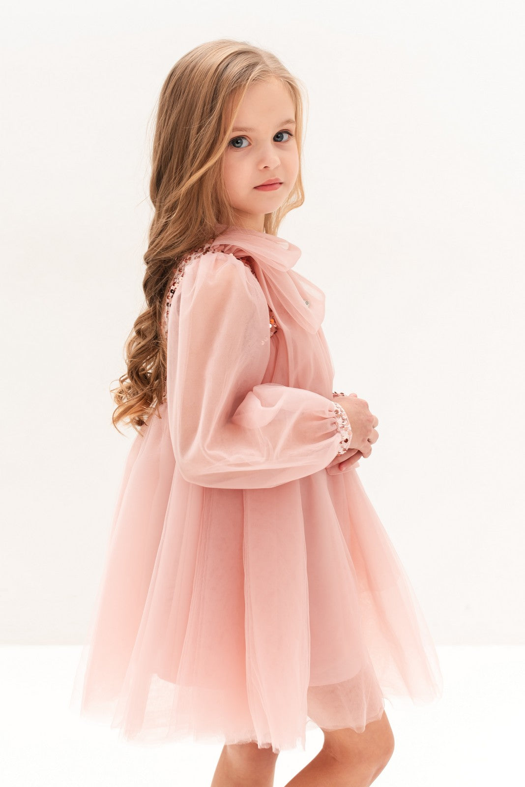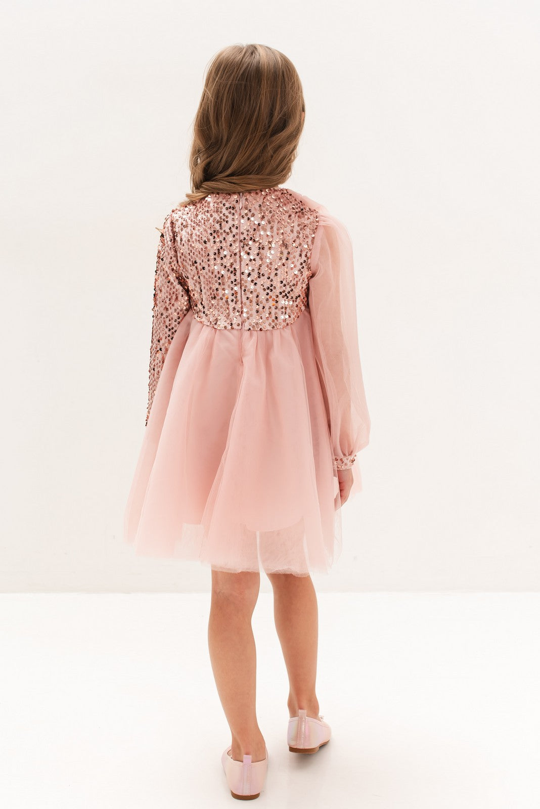 Această rochie rafinată este alegerea perfectă pentru micile domnișoare care doresc să impresioneze la orice ocazie specială. Realizată într-o nuanță delicată de roz, rochia „Abelia” se remarcă prin combinația de materiale fine: partea de sus cu paiete strălucitoare și mâneci transparente adaugă un aer sofisticat, în timp ce fusta amplă din tulle vaporos conferă volum și lejeritate. Accesoriul tip fundă aplicat pe umăr completează designul cu un detaliu feminin și elegant.