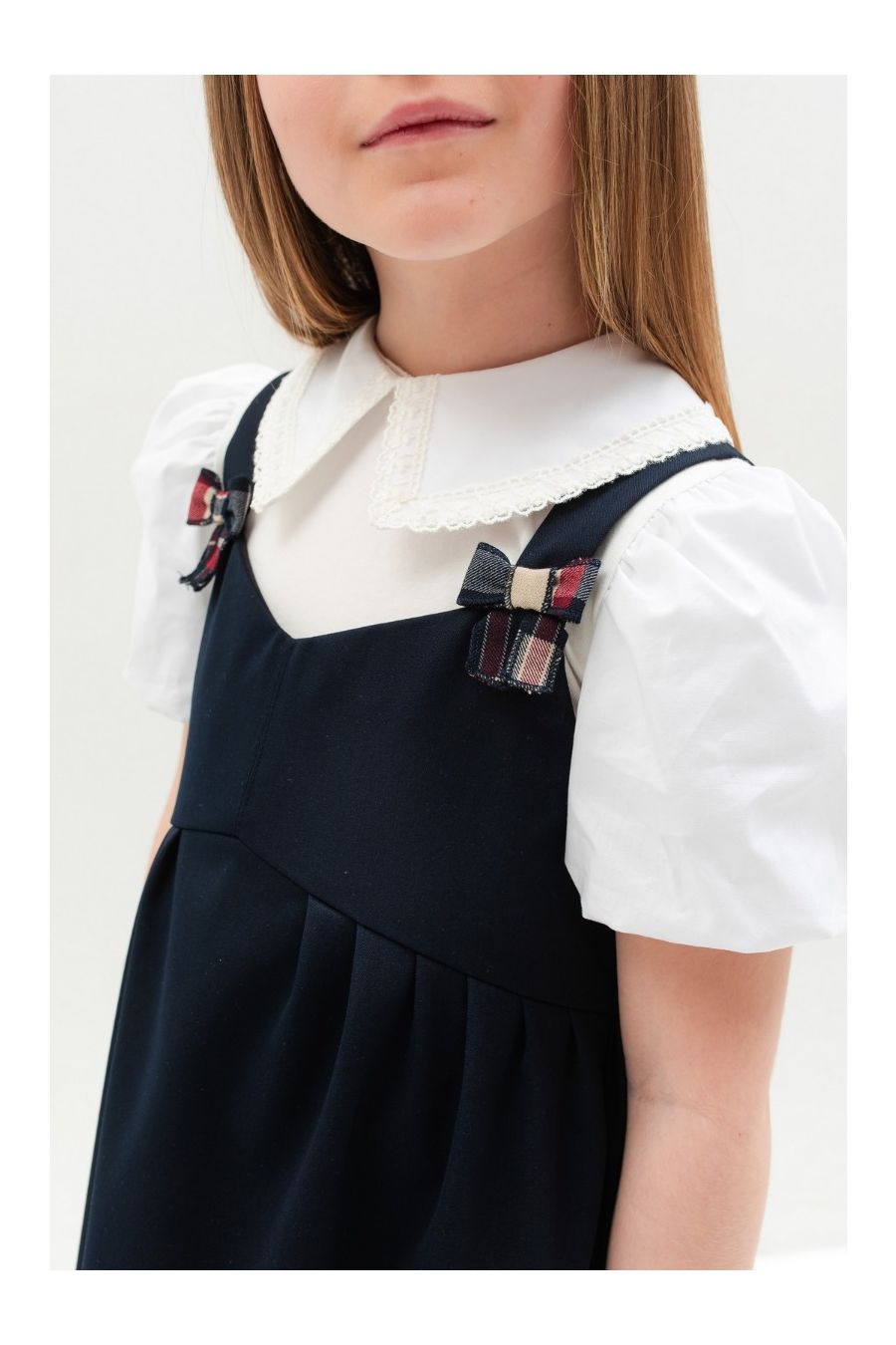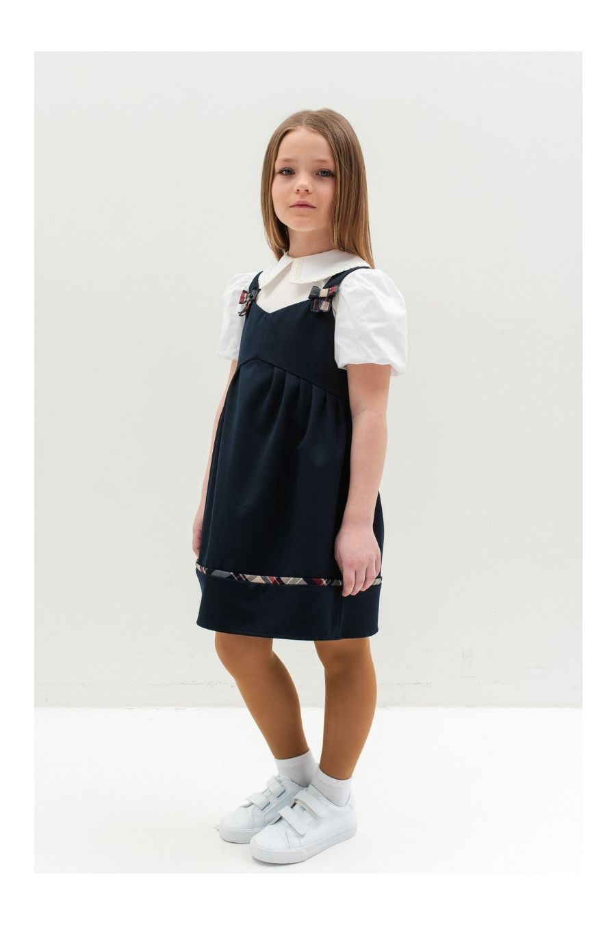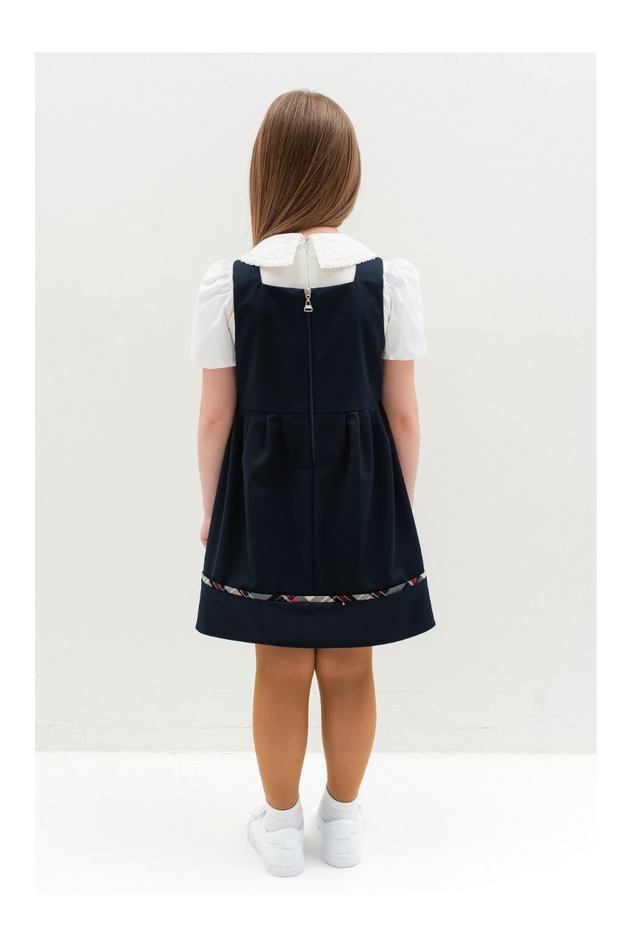 Această uniformă tip sarafan pentru fetițe este confecționată dintr-un amestec de bumbac și poliester, oferind atât confort, cât și rezistență pentru utilizarea zilnică. Designul clasic și elegant include bretele late și o fustă plisată, fiind ideal pentru școală. Materialul respirabil și ușor de întreținut face această uniformă perfectă pentru activitățile zilnice, iar închiderea cu fermoar lateral asigură o îmbrăcare rapidă și ușoară. Poate fi asortată cu o cămașă sau o bluză pentru un aspect complet și ordonat.
