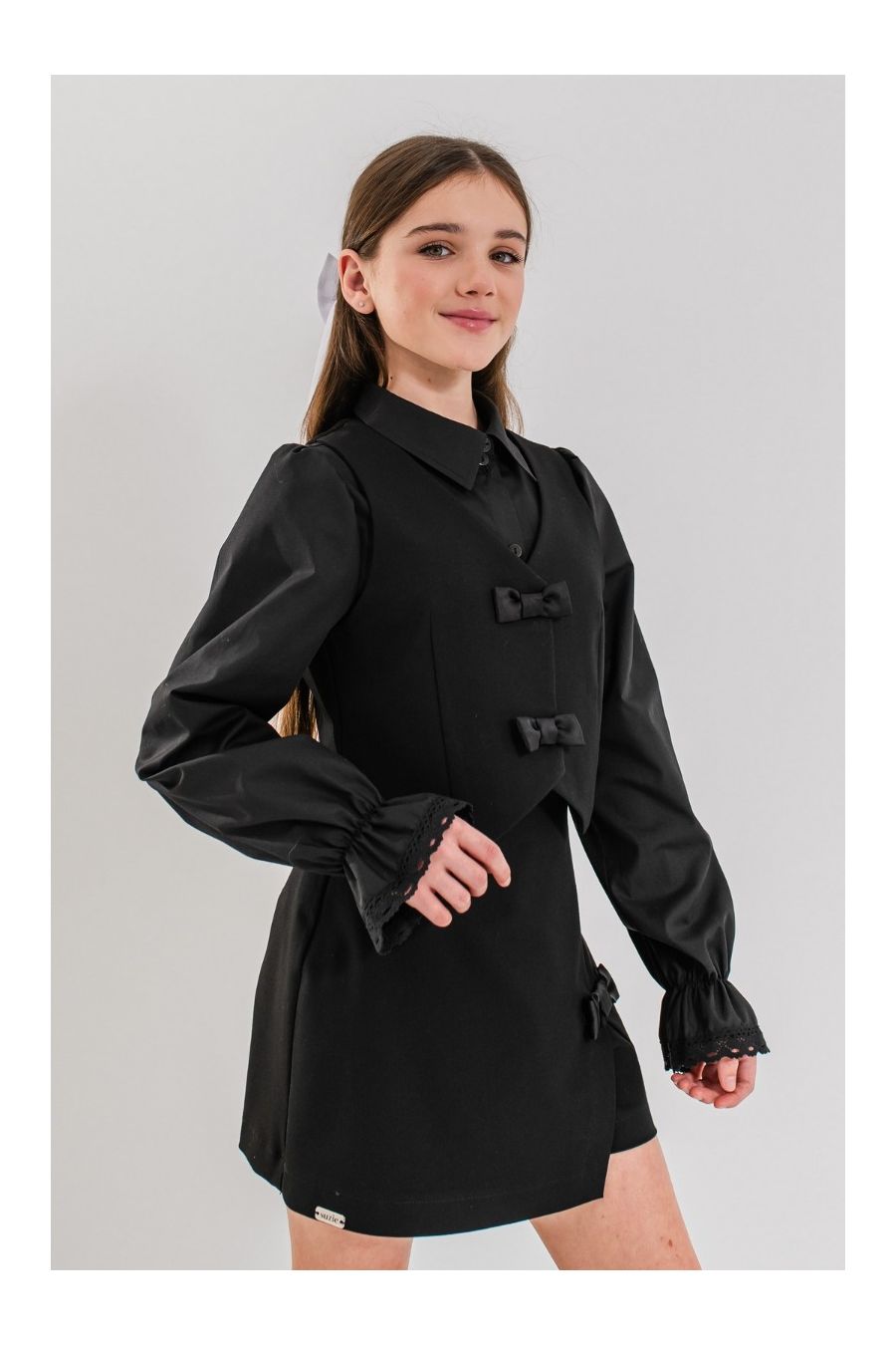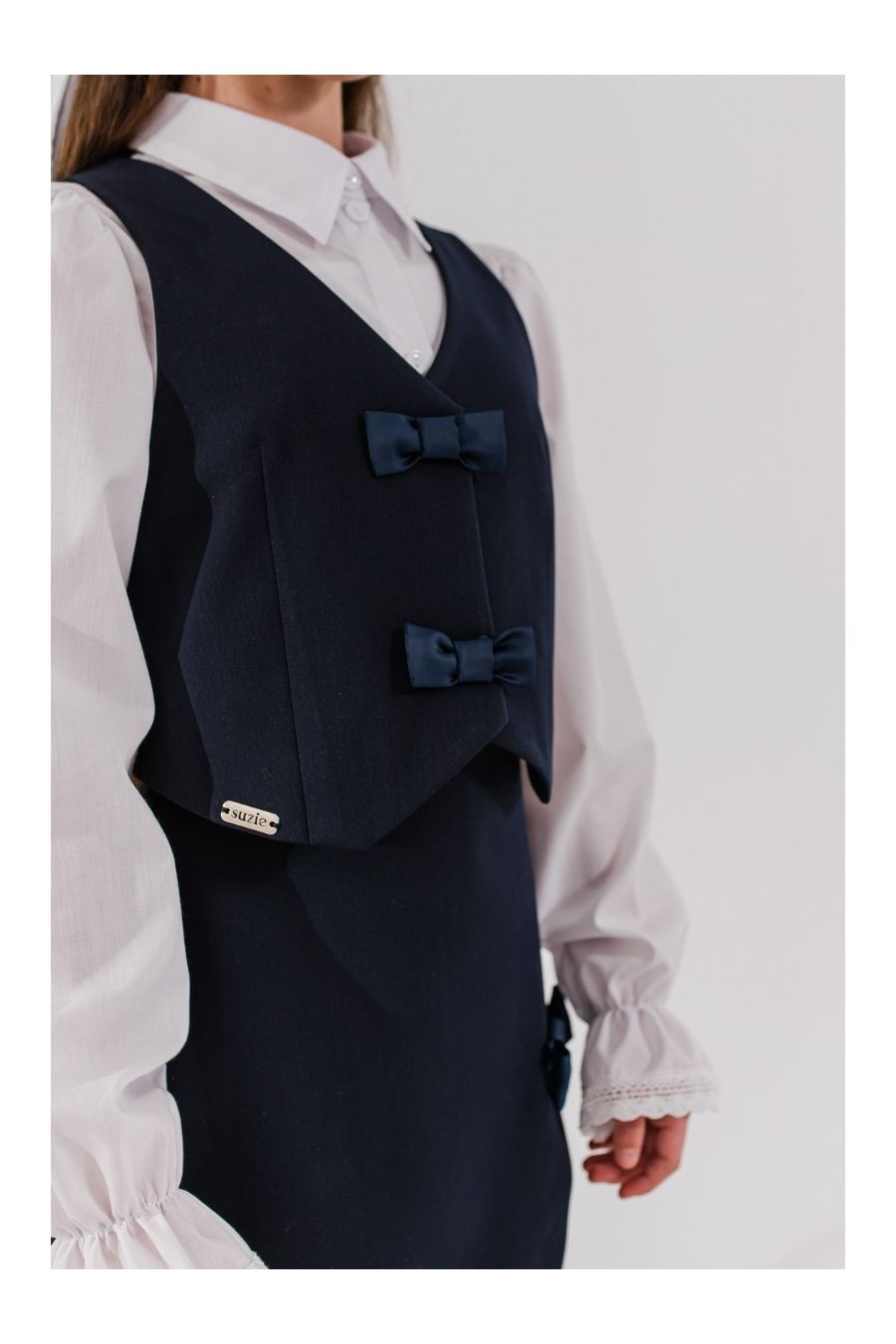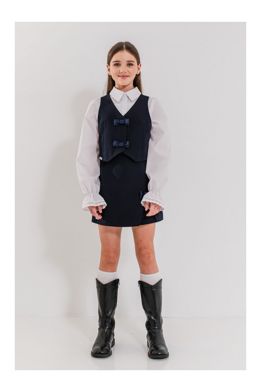 Realizată dintr-un material rezistent ușor și plăcut la purtare, cu croială scurtă și două fundițe decorative în față, această vestă este ideală pentru a fi purtată peste cămăși sau bluze. Un plus de rafinament care merge la fel de bine la școală, cât și la evenimente festive.