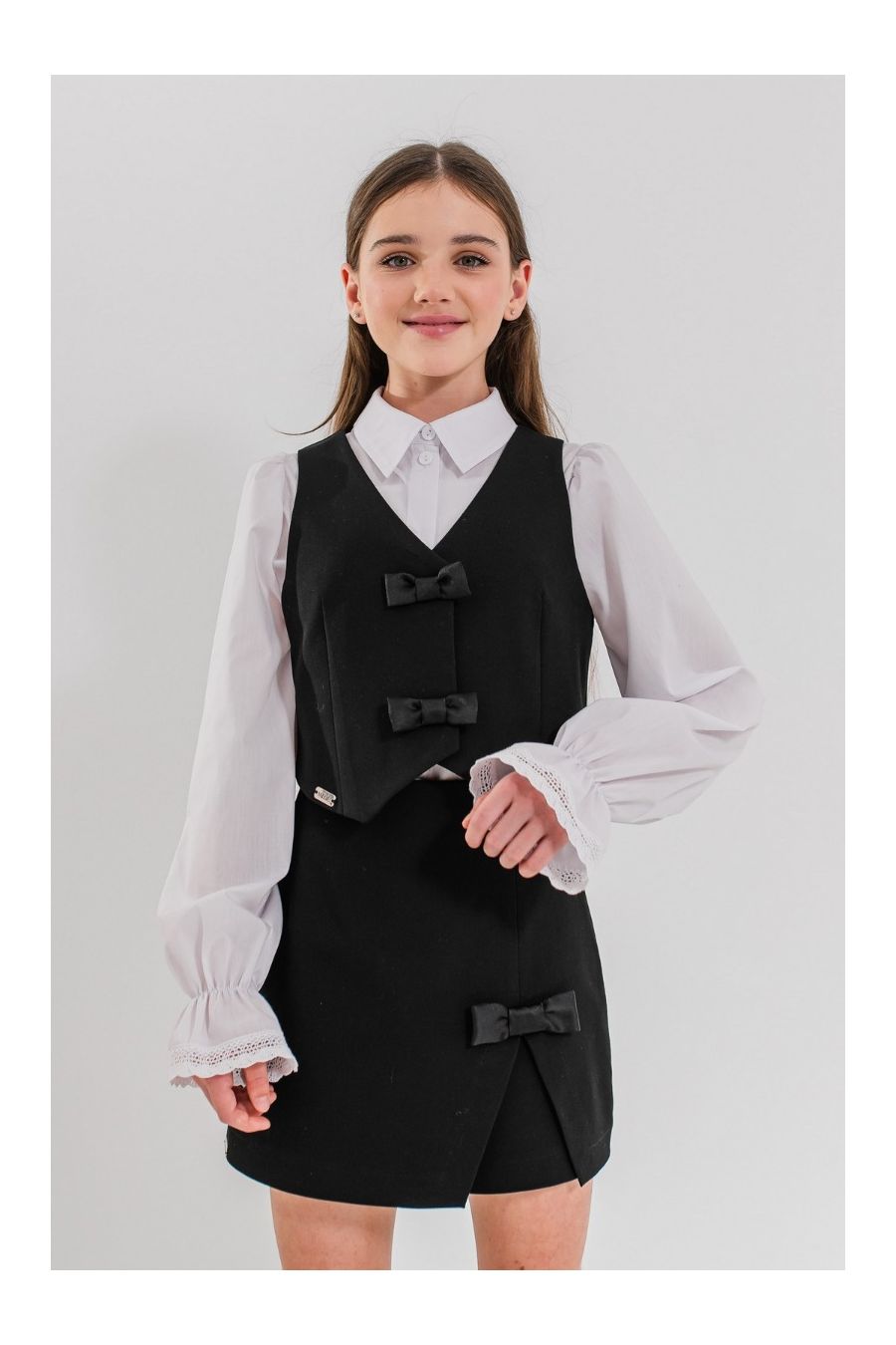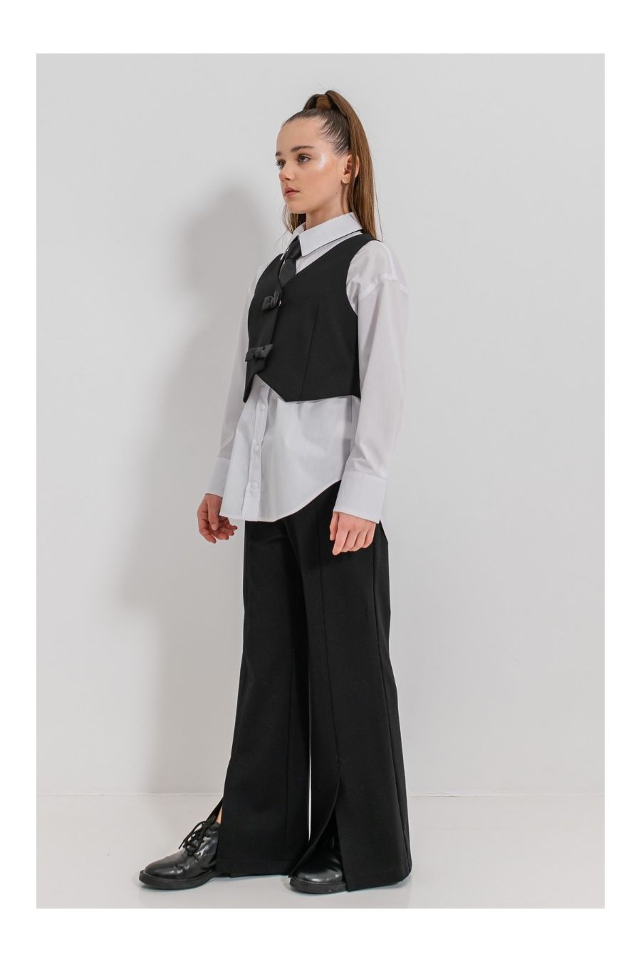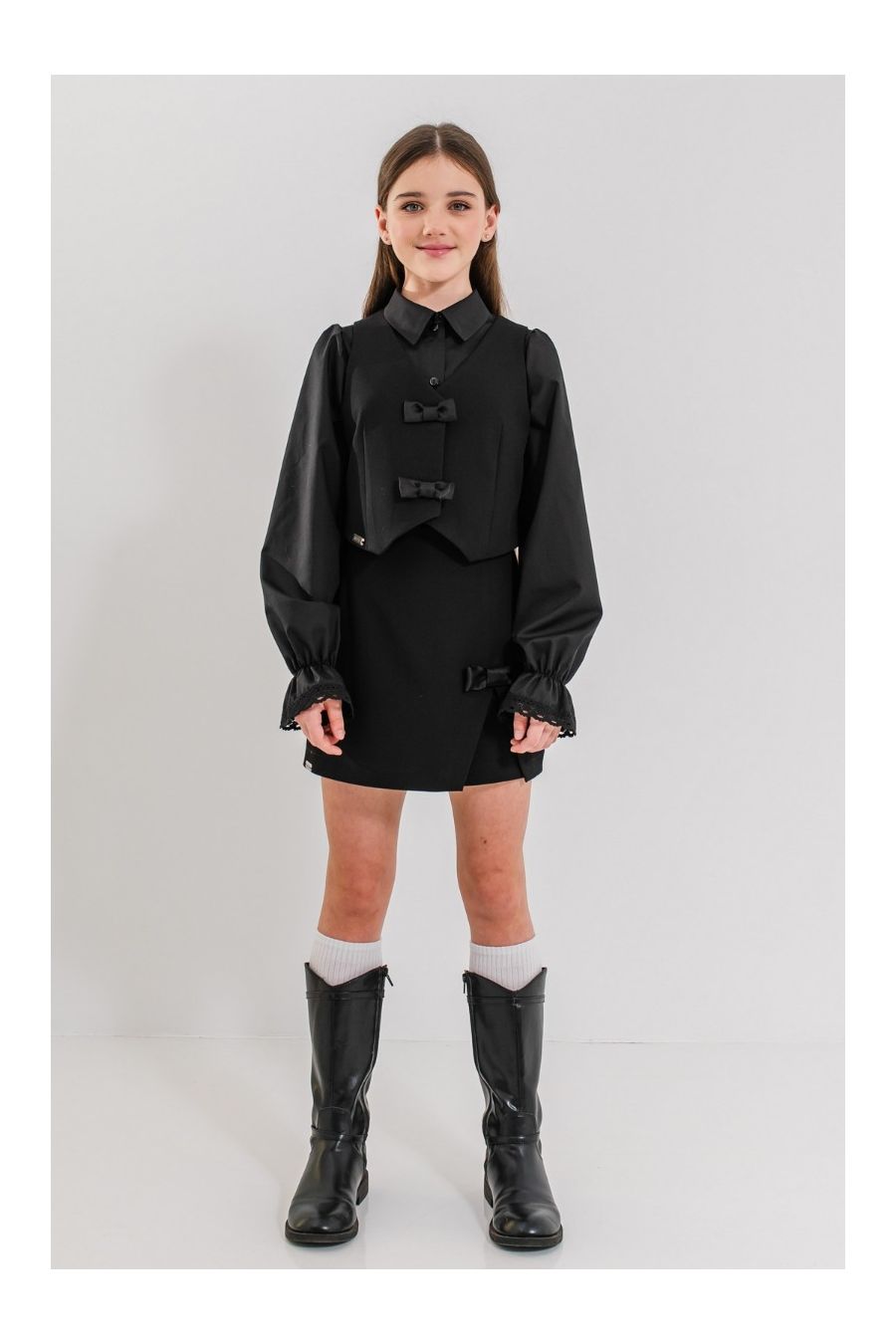Realizată dintr-un material rezistent ușor și plăcut la purtare, cu croială scurtă și două fundițe decorative în față, această vestă este ideală pentru a fi purtată peste cămăși sau bluze. Un plus de rafinament care merge la fel de bine la școală, cât și la evenimente festive.