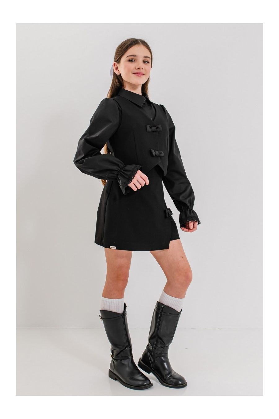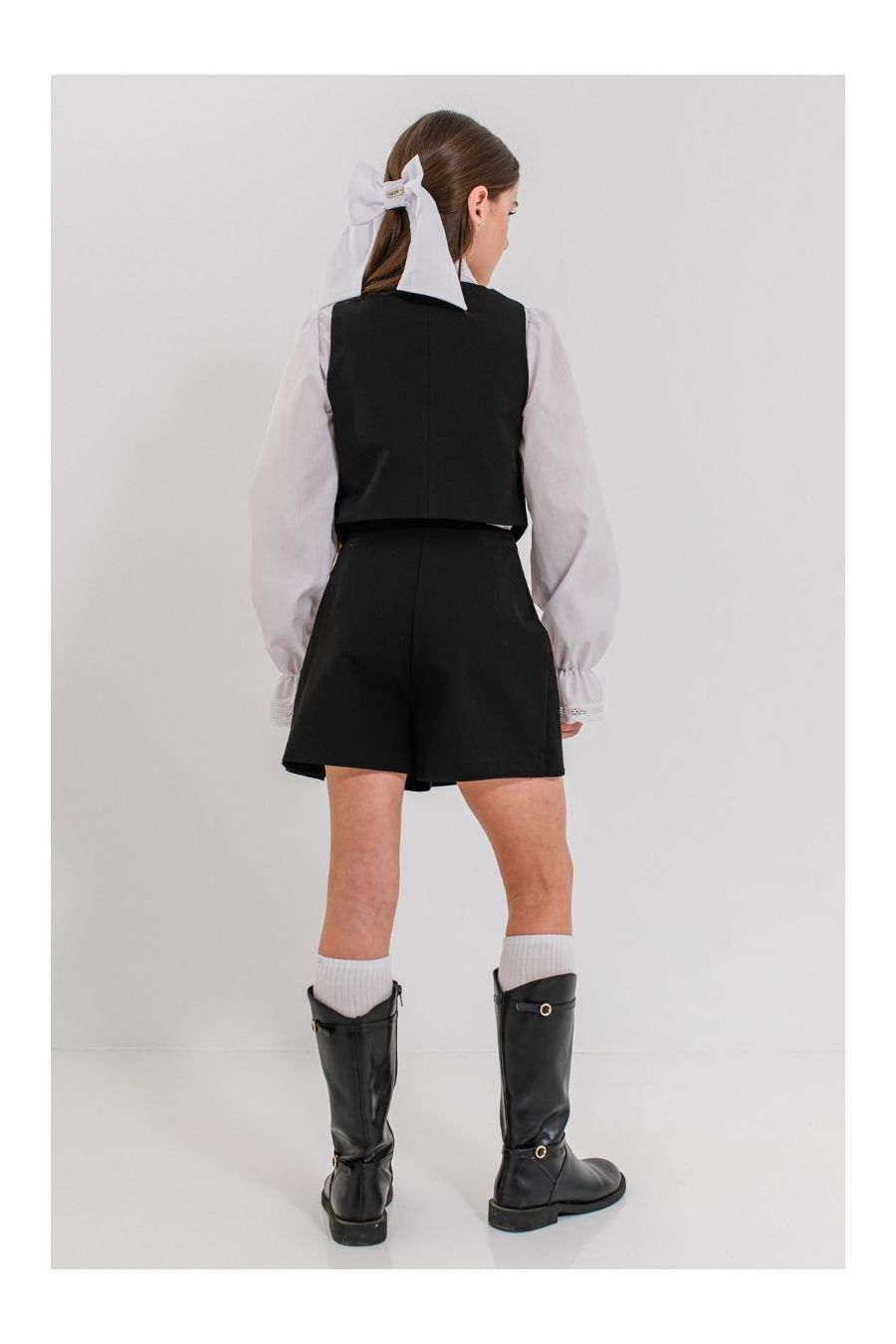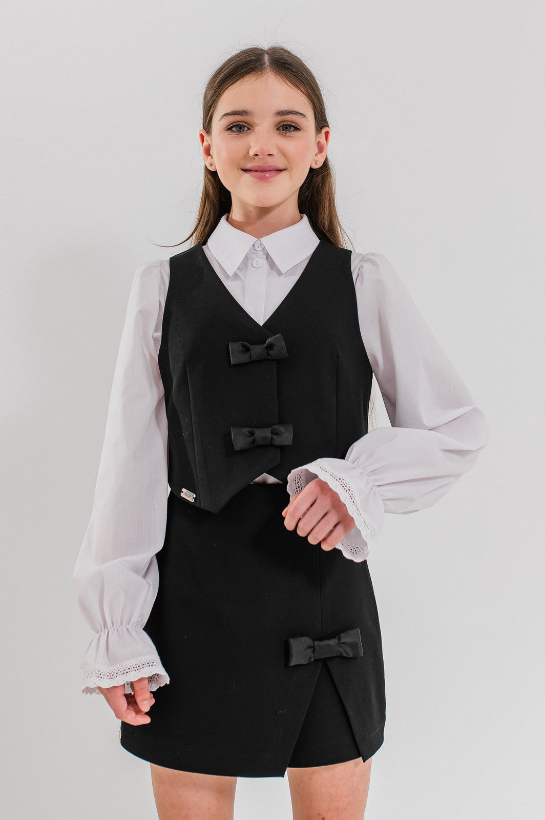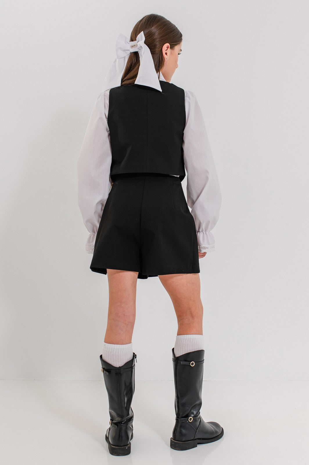 Realizată dintr-un material ușor și plăcut la purtare, cu croială scurtă și două fundițe decorative în față, această vestă este ideală pentru a fi purtată peste cămăși sau bluze. Un plus de rafinament care merge la fel de bine la școală, cât și la evenimente festive.